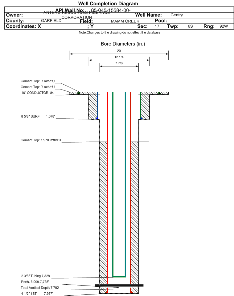Wellbore #00 Wellbore Classification: GW Status: PR - 12/1/2012 Measured TD: 7976 ft. Vertical TD: 7792 ft.| Wellbore Data for Original Wellbore | Wellbore Classification: GW PR - 12/1/2012 | | Wellbore Permit | DIRECTIONAL | | Permit #: | | Expiration Date: | 2/9/2014 | | Proposed Top PZ Location: | Sec:17 Twp: 6S 92W | Footage: 2137 FSL 1925 FWL | | Bottom Hole Location: | Sec:17 Twp: 6S 92W | Footage: 2137 FSL 1925 FWL | | Proposed Depth/Form: | 7960 ft. | | Surface Mineral Owner Same: | Yes | | Mineral Owner: | FEE | Surface Owner: | FEE | | Unit: | | Unit Number: | | | Formation And Spacing: | Code: ILES , Formation: ILES , Order: 191-25 , Unit Acreage: 320, Drill Unit: N/2, S/2 | | Formation And Spacing: | Code: WMFK , Formation: WILLIAMS FORK , Order: 191-24 , Unit Acreage: 320, Drill Unit: N/2, S/2 | | Casing: | String Type: CONDUCTOR, Hole Size: 24 in., Size: 16 in., Top: 0 ft., Depth: 60 ft., Weight: 55# , Citings Type: PLANNED | | Cement: | Sacks: 177, Top: 0 ft., Bottom: 60 ft. | | Casing: | String Type: SURF, Hole Size: 12.25 in., Size: 8.625 in., Top: 0 ft., Depth: 1000 ft., Weight: 24/32# , Citings Type: PLANNED | | Cement: | Sacks: 439, Top: 0 ft., Bottom: 1000 ft. | | Casing: | String Type: 1ST, Hole Size: 7.875 in., Size: 4.5 in., Top: 0 ft., Depth: 7960 ft., Weight: 11.6# , Citings Type: PLANNED | | Cement: | Sacks: 1324, Top: , Bottom: 7960 ft. | | Casing: | String Type: 2ND, Hole Size: 7.875 in., Size: 5.5 in., Top: , Depth: 8819 ft., Weight: 17# , Citings Type: PLANNED | | Cement: | Sacks: 768, Top: 4549 ft., Bottom: 8819 ft. |