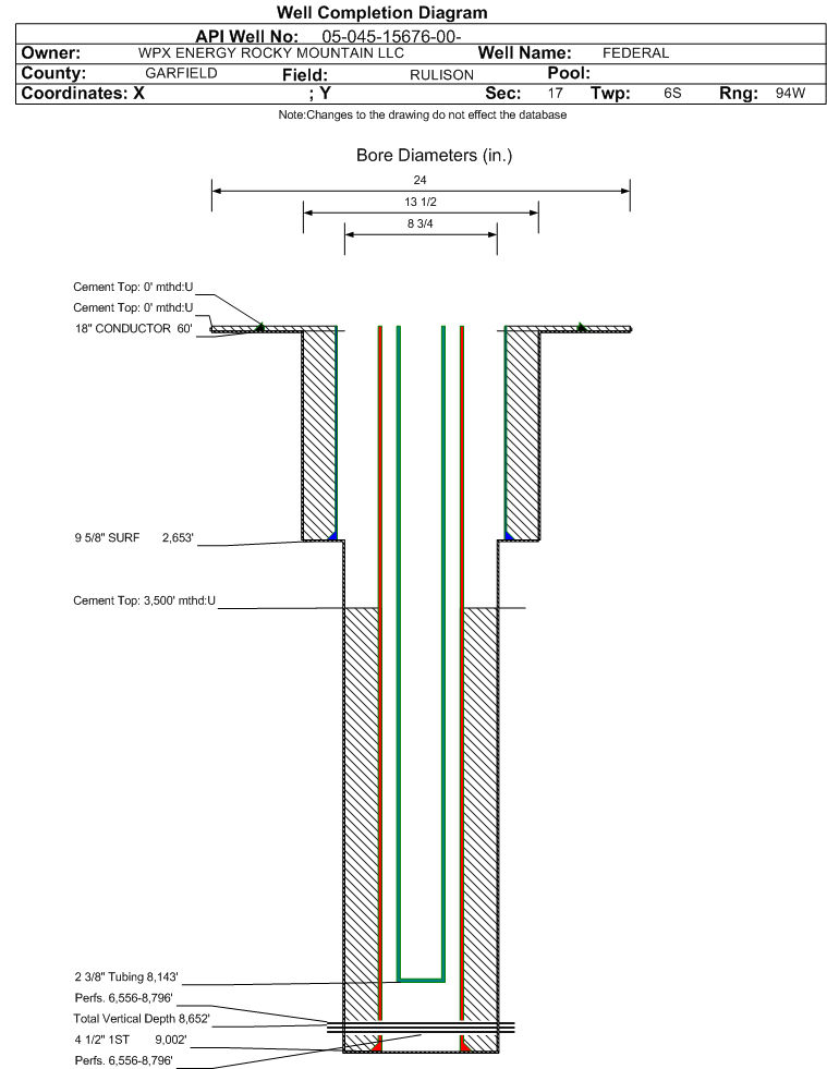 Wellbore #00 Wellbore Classification: GW Status: PR - 10/1/2025 Measured TD: 9021 ft. Vertical TD: 8652 ft.| Wellbore Data for Original Wellbore | Wellbore Classification: GW PR - 10/1/2025 | | Wellbore Permit | DIRECTIONAL | | Permit #: | 20088076 | Expiration Date: | 2/11/2010 | | Proposed Top PZ Location: | Sec: Twp: | Footage: 540 FNL 740 FEL | | Bottom Hole Location: | Sec:17 Twp: 6S 94W | Footage: 540 FNL 740 FEL | | Proposed Depth/Form: | 8884 ft. | | Surface Mineral Owner Same: | Yes | | Mineral Owner: | FEDERAL | Surface Owner: | FEDERAL | | Unit: | | Unit Number: | | | Formation And Spacing: | Code: WMFK , Formation: WILLIAMS FORK , Order: 139-40 , Unit Acreage: 320, Drill Unit: E2 | | Casing: | String Type: CONDUCTOR, Hole Size: 24 in., Size: 18 in., Top: , Depth: 45 ft., Weight: 48 , Citings Type: PLANNED | | Cement: | Sacks: , Top: 0 ft., Bottom: 45 ft. | | Casing: | String Type: SURF, Hole Size: 13.5 in., Size: 9.625 in., Top: , Depth: 2575 ft., Weight: 32.3 , Citings Type: PLANNED | | Cement: | Sacks: , Top: 0 ft., Bottom: 2575 ft. | | Casing: | String Type: 1ST, Hole Size: 7.875 in., Size: 4.5 in., Top: , Depth: 8884 ft., Weight: 11.6 , Citings Type: PLANNED | | Cement: | Sacks: , Top: , Bottom: |