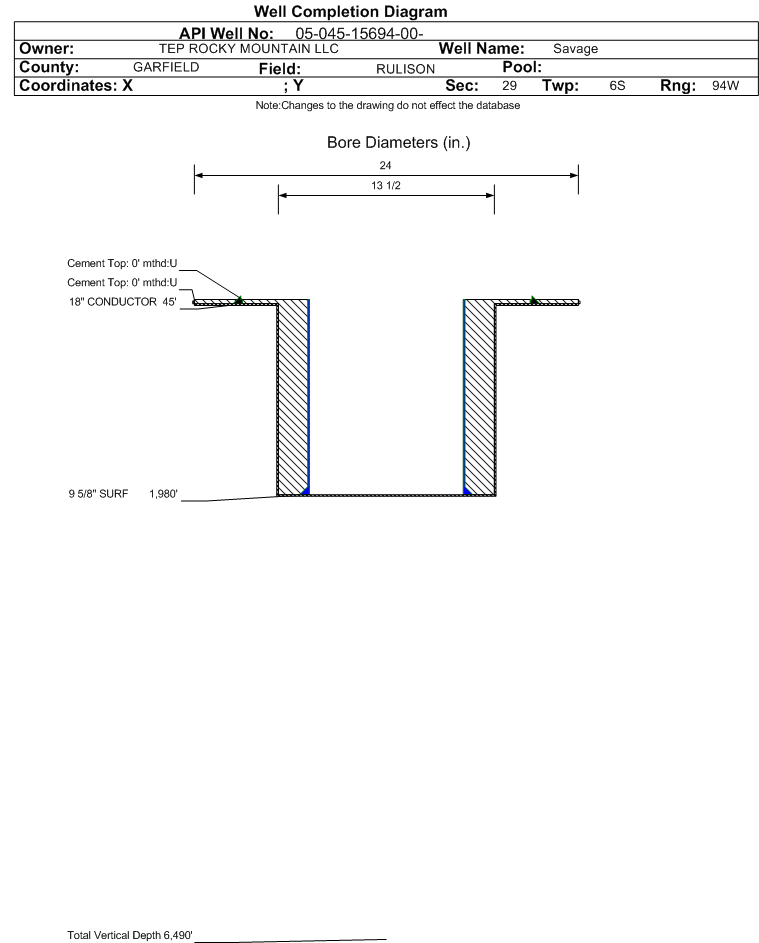 Wellbore #00 Wellbore Classification: GW Status: AB - 8/17/1960 Measured TD: 6767 ft. Vertical TD: 6490 ft.| Wellbore Data for Original Wellbore | Wellbore Classification: GW AB - 8/17/1960 | | Wellbore Permit | DIRECTIONAL | | Permit #: | 20080419 | Expiration Date: | 3/24/2009 | | Proposed Top PZ Location: | Sec: Twp: | Footage: 1100 FSL 1964 FEL | | Bottom Hole Location: | Sec:29 Twp: 6S 94W | Footage: 1100 FSL 1964 FEL | | Proposed Depth/Form: | 7877 ft. | | Surface Mineral Owner Same: | No | | Mineral Owner: | FEE | Surface Owner: | FEE | | Unit: | | Unit Number: | | | Formation And Spacing: | Code: WMFK , Formation: WILLIAMS FORK , Order: 139-64 , Unit Acreage: 320, Drill Unit: S2 | | Casing: | String Type: 1ST, Hole Size: 7.875 in., Size: 4.5 in., Top: , Depth: 7877 ft., Weight: 11.6 , Citings Type: PLANNED | | Cement: | Sacks: , Top: , Bottom: |