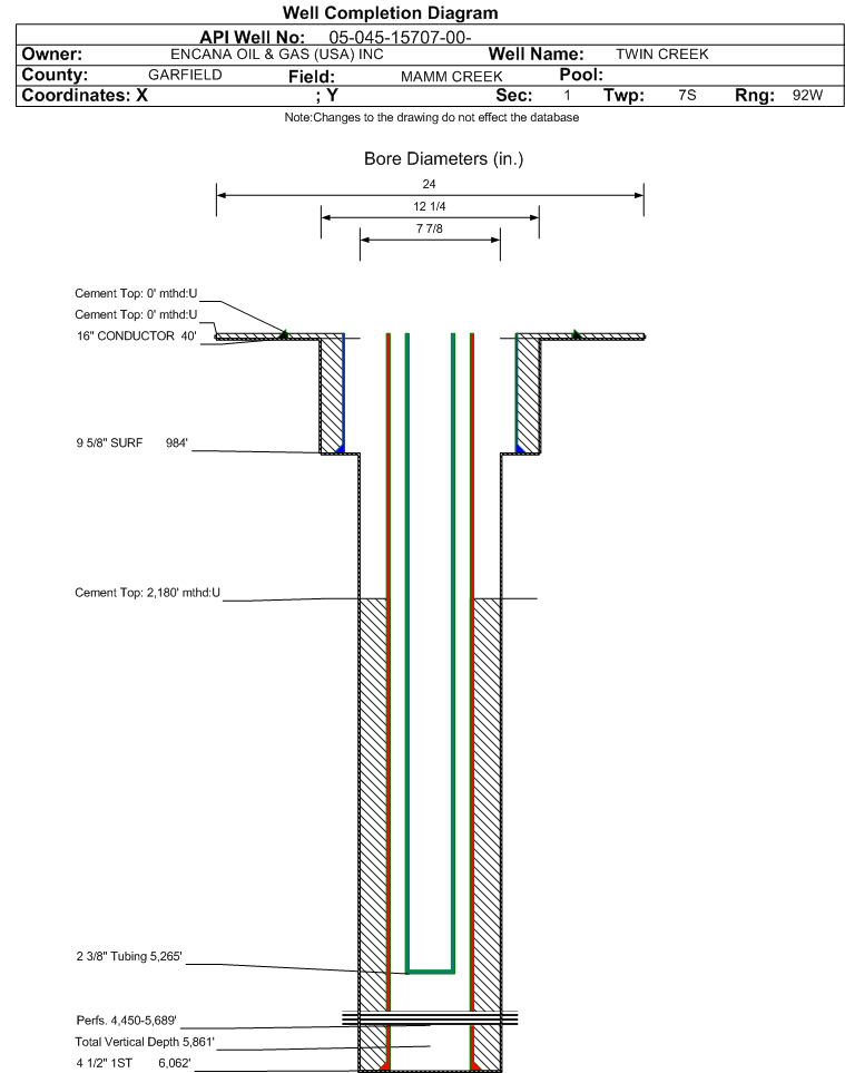 | Wellbore Completed | | Completion Date: | 2/20/2009 | | Spud Date: | 2/9/2009 | Spud Date Is: | ACTUAL | | Measured TD: | 6072 ft. | Measured PB depth: | 6015 ft. | | True Vertical TD: | 5861 ft. | True Vertical PB depth: | 5958 ft. | | Top PZ Location: | Sec:1 Twp: 7S 92W | Footage: 319 FNL 1998 FWL | | Bottom Hole Location: | Sec:1 Twp: 7S 92W | Footage: 319 FNL 1998 FWL | | Log Types: | RST/CBL | | Casing: | String Type: CONDUCTOR, Hole Size: 24 in., Size: 16 in., Top: 0 ft., Depth: 40 ft., Weight: , Citings Type: ACTUAL | | Cement: | Sacks: 100, Top: 0 ft., Bottom: 40 ft., Determination Method: CALC | | Casing: | String Type: SURF, Hole Size: 12.25 in., Size: 9.625 in., Top: 0 ft., Depth: 984 ft., Weight: , Citings Type: ACTUAL | | Cement: | Sacks: 531, Top: 0 ft., Bottom: 984 ft., Determination Method: CALC | | Casing: | String Type: 1ST, Hole Size: 7.875 in., Size: 4.5 in., Top: 0 ft., Depth: 6062 ft., Weight: , Citings Type: ACTUAL | | Cement: | Sacks: 1091, Top: 2180 ft., Bottom: 6062 ft., Determination Method: CALC | | Formation | Interval Top | Log Bottom | Cored | DSTs | | WASATCH | 0 ft. | 3585 ft. | N | N | | WILLIAMS FORK | 3585 ft. | 6072 ft. | N | N |