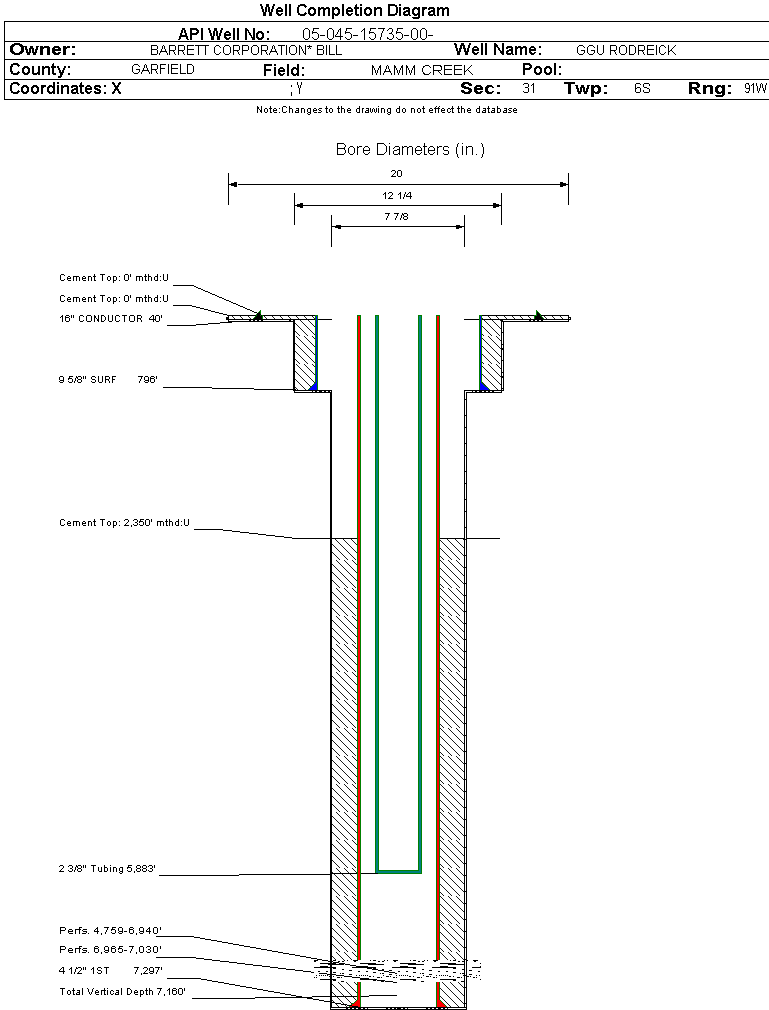 Wellbore #00 Wellbore Classification: GW Status: PR - 9/10/2008 Measured TD: 7308 ft. Vertical TD: 7160 ft.| Wellbore Data for Original Wellbore | Wellbore Classification: GW PR - 9/10/2008 | | Wellbore Permit | DIRECTIONAL | | Permit #: | 20080847 | Expiration Date: | 4/3/2009 | | Proposed Top PZ Location: | Sec: Twp: | Footage: 1107 FNL 495 FEL | | Bottom Hole Location: | Sec:31 Twp: 6S 91W | Footage: 1107 FNL 495 FEL | | Proposed Depth/Form: | 7394 ft. | | Surface Mineral Owner Same: | No | | Mineral Owner: | FEE | Surface Owner: | FEE | | Unit: | GIBSON GULCH UN | Unit Number: | COC 052447X | | Formation And Spacing: | Code: ILES , Formation: ILES , Order: , Unit Acreage: , Drill Unit: | | Formation And Spacing: | Code: WMFK , Formation: WILLIAMS FORK , Order: 191-9 , Unit Acreage: , Drill Unit: |