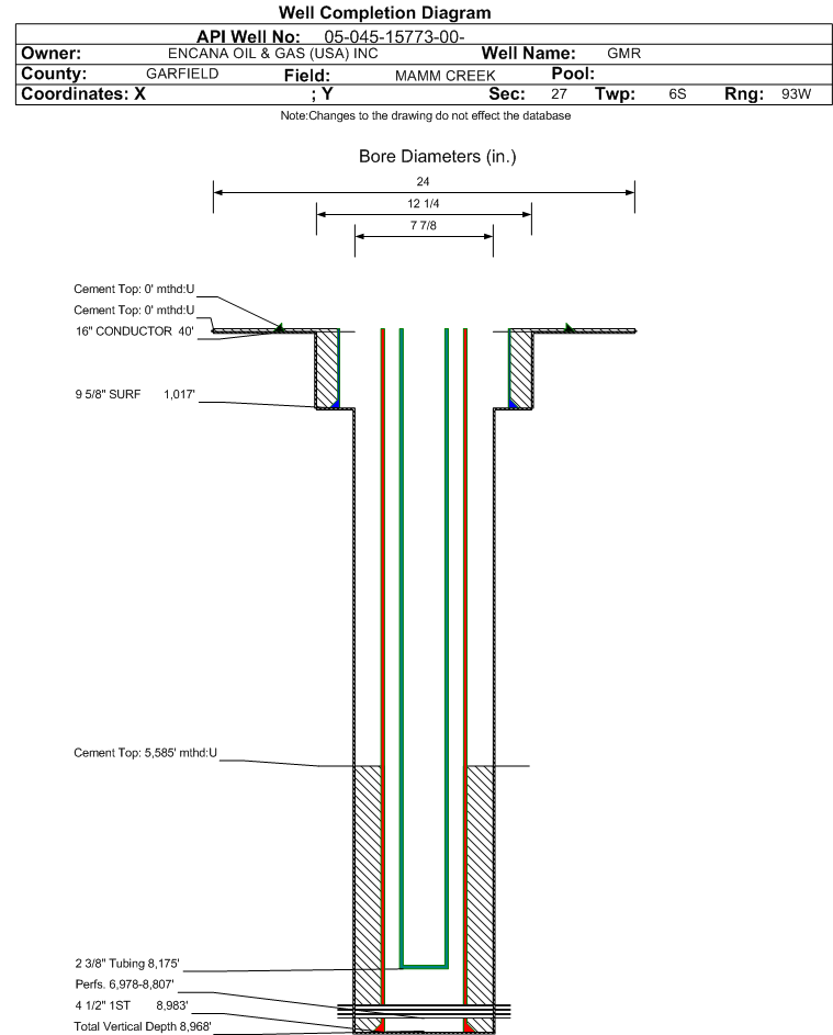 | Wellbore Completed | | Completion Date: | 1/13/2009 | | Spud Date: | 12/29/2008 | Spud Date Is: | ACTUAL | | Measured TD: | 8994 ft. | Measured PB depth: | 8942 ft. | | True Vertical TD: | 8968 ft. | True Vertical PB depth: | 8916 ft. | | Top PZ Location: | Sec:27 Twp: 6S 93W | Footage: 711 FSL 1292 FWL | | Bottom Hole Location: | Sec:27 Twp: 6S 93W | Footage: 711 FSL 1292 FWL | | Log Types: | RST/CBL COMBO LOG | | Casing: | String Type: CONDUCTOR, Hole Size: 24 in., Size: 16 in., Top: 0 ft., Depth: 40 ft., Weight: , Citings Type: ACTUAL | | Cement: | Sacks: 100, Top: 0 ft., Bottom: 40 ft., Determination Method: CALC | | Casing: | String Type: SURF, Hole Size: 12.25 in., Size: 9.625 in., Top: 0 ft., Depth: 1017 ft., Weight: 36 , Citings Type: ACTUAL | | Cement: | Sacks: 332, Top: 0 ft., Bottom: 1017 ft., Determination Method: CALC | | Casing: | String Type: 1ST, Hole Size: 7.875 in., Size: 4.5 in., Top: 0 ft., Depth: 8983 ft., Weight: 11.6 , Citings Type: ACTUAL | | Cement: | Sacks: 608, Top: 5585 ft., Bottom: 8994 ft., Determination Method: CBL | | Formation | Interval Top | Log Bottom | Cored | DSTs | | WASATCH | 0 ft. | 5868 ft. | N | N | | WILLIAMS FORK | 5868 ft. | 8994 ft. | N | N |