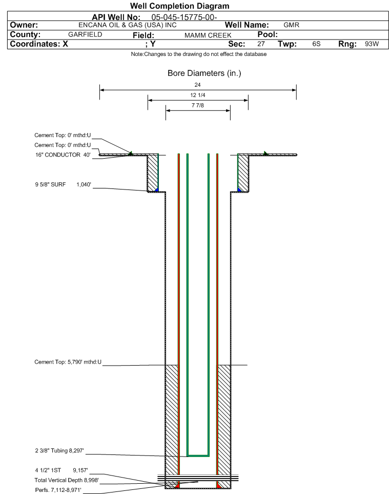 | Wellbore Completed | | Completion Date: | 12/10/2008 | | Spud Date: | 11/22/2008 | Spud Date Is: | ACTUAL | | Measured TD: | 9160 ft. | Measured PB depth: | 9110 ft. | | True Vertical TD: | 8998 ft. | True Vertical PB depth: | 8949 ft. | | Top PZ Location: | Sec:27 Twp: 6S 93W | Footage: 1760 FSL 2203 FWL | | Bottom Hole Location: | Sec:27 Twp: 6S 93W | Footage: 1760 FSL 2203 FWL | | Log Types: | RST, CBL | | Casing: | String Type: CONDUCTOR, Hole Size: 24 in., Size: 16 in., Top: 0 ft., Depth: 40 ft., Weight: , Citings Type: ACTUAL | | Cement: | Sacks: 100, Top: 0 ft., Bottom: 40 ft., Determination Method: CALC | | Casing: | String Type: SURF, Hole Size: 12.25 in., Size: 9.625 in., Top: 0 ft., Depth: 1040 ft., Weight: , Citings Type: ACTUAL | | Cement: | Sacks: 332, Top: 0 ft., Bottom: 1050 ft., Determination Method: CALC | | Casing: | String Type: 1ST, Hole Size: 7.875 in., Size: 4.5 in., Top: 0 ft., Depth: 9157 ft., Weight: 11.6 , Citings Type: ACTUAL | | Cement: | Sacks: 655, Top: 5790 ft., Bottom: 9160 ft., Determination Method: CBL | | Formation | Interval Top | Log Bottom | Cored | DSTs | | WASATCH | 0 ft. | 6031 ft. | N | N | | WILLIAMS FORK | 6031 ft. | 9074 ft. | N | N | | ROLLINS | 9074 ft. | 9160 ft. | N | N |