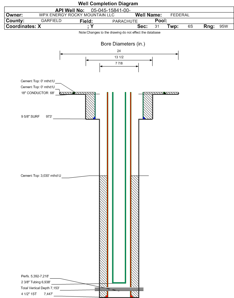 Wellbore #00 Wellbore Classification: GW Status: PR - 7/28/2010 Measured TD: 7467 ft. Vertical TD: 7153 ft.| Wellbore Data for Original Wellbore | Wellbore Classification: GW PR - 7/28/2010 | | Wellbore Permit | DIRECTIONAL | | Permit #: | 20090557 | Expiration Date: | 4/13/2010 | | Proposed Top PZ Location: | Sec: Twp: | Footage: 875 FSL 484 FEL | | Bottom Hole Location: | Sec:30 Twp: 6S 95W | Footage: 875 FSL 484 FEL | | Proposed Depth/Form: | 7499 ft. | | Surface Mineral Owner Same: | Yes | | Mineral Owner: | FEDERAL | Surface Owner: | FEDERAL | | Unit: | | Unit Number: | | | Formation And Spacing: | Code: WMFK , Formation: WILLIAMS FORK , Order: 440-25 , Unit Acreage: , Drill Unit: |