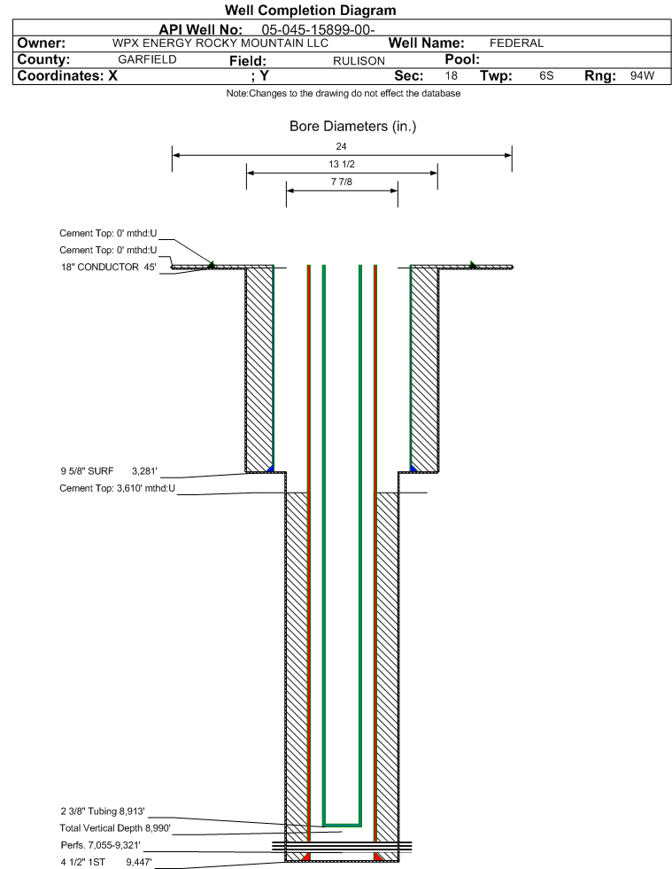 | Wellbore Completed | | Completion Date: | 9/19/2008 | | Spud Date: | 9/4/2008 | Spud Date Is: | ACTUAL | | Measured TD: | 9460 ft. | Measured PB depth: | 9422 ft. | | True Vertical TD: | 8990 ft. | True Vertical PB depth: | 8952 ft. | | Top PZ Location: | Sec:7 Twp: 6S 94W | Footage: 299 FSL 2203 FEL | | Bottom Hole Location: | Sec:7 Twp: 6S 94W | Footage: 299 FSL 2203 FEL | | Log Types: | CBL, HIGH RES.INDUCTION, SPECTRAL DENSITY,DUAL SPACED NEUTRON, MUD | | Casing: | String Type: CONDUCTOR, Hole Size: 24 in., Size: 18 in., Top: 0 ft., Depth: 45 ft., Weight: 48 , Citings Type: ACTUAL | | Cement: | Sacks: 25, Top: 0 ft., Bottom: 45 ft., Determination Method: | | Casing: | String Type: SURF, Hole Size: 13.5 in., Size: 9.625 in., Top: 0 ft., Depth: 3281 ft., Weight: 32.3 , Citings Type: ACTUAL | | Cement: | Sacks: 714, Top: 0 ft., Bottom: 3281 ft., Determination Method: | | Casing: | String Type: 1ST, Hole Size: 7.875 in., Size: 4.5 in., Top: 0 ft., Depth: 9447 ft., Weight: 11.6 , Citings Type: ACTUAL | | Cement: | Sacks: 1093, Top: 3610 ft., Bottom: 9447 ft., Determination Method: CBL | | Formation | Interval Top | Log Bottom | Cored | DSTs | | WASATCH G | 3039 ft. | | N | N | | MESAVERDE | 5679 ft. | | N | N | | CAMEO | 8416 ft. | | N | N | | ROLLINS | 9395 ft. | | N | N |