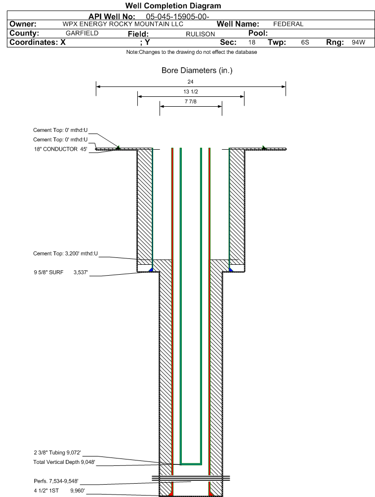 | Wellbore Completed | | Completion Date: | 1/14/2009 | | Spud Date: | 12/28/2008 | Spud Date Is: | ACTUAL | | Measured TD: | 9972 ft. | Measured PB depth: | 9886 ft. | | True Vertical TD: | 9048 ft. | True Vertical PB depth: | 8962 ft. | | Top PZ Location: | Sec:7 Twp: 6S 94W | Footage: 1886 FSL 2161 FEL | | Bottom Hole Location: | Sec:7 Twp: 6S 94W | Footage: 1886 FSL 2161 FEL | | Log Types: | CBL, RMTE, MUD | | Casing: | String Type: CONDUCTOR, Hole Size: 24 in., Size: 18 in., Top: 0 ft., Depth: 45 ft., Weight: 48 , Citings Type: ACTUAL | | Cement: | Sacks: 25, Top: 0 ft., Bottom: 45 ft., Determination Method: | | Casing: | String Type: SURF, Hole Size: 13.5 in., Size: 9.625 in., Top: 0 ft., Depth: 3537 ft., Weight: 32.3 , Citings Type: ACTUAL | | Cement: | Sacks: 780, Top: 0 ft., Bottom: 3337 ft., Determination Method: | | Casing: | String Type: 1ST, Hole Size: 7.875 in., Size: 4.5 in., Top: 0 ft., Depth: 9960 ft., Weight: 11.6 , Citings Type: ACTUAL | | Cement: | Sacks: 1150, Top: 3200 ft., Bottom: 9960 ft., Determination Method: CBL | | Formation | Interval Top | Log Bottom | Cored | DSTs | | WASATCH G | 3330 ft. | | N | N | | MESAVERDE | 6158 ft. | | N | N | | CAMEO | 8901 ft. | | N | N | | ROLLINS | 9850 ft. | | N | N |