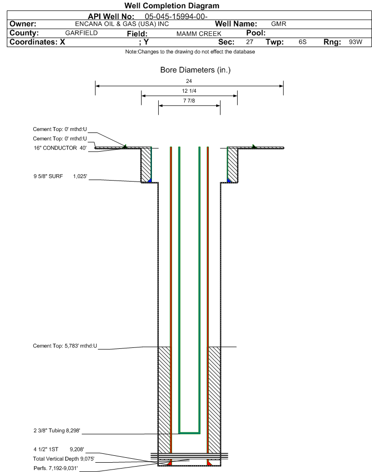 | Wellbore Completed | | Completion Date: | 1/29/2009 | | Spud Date: | 1/14/2009 | Spud Date Is: | ACTUAL | | Measured TD: | 9218 ft. | Measured PB depth: | 9160 ft. | | True Vertical TD: | 9075 ft. | True Vertical PB depth: | 9017 ft. | | Top PZ Location: | Sec:28 Twp: 6S 93W | Footage: 1986 FSL 8 FEL | | Bottom Hole Location: | Sec:28 Twp: 6S 93W | Footage: 1986 FSL 8 FEL | | Log Types: | RFST, CBL | | Casing: | String Type: CONDUCTOR, Hole Size: 24 in., Size: 16 in., Top: 0 ft., Depth: 40 ft., Weight: , Citings Type: ACTUAL | | Cement: | Sacks: 100, Top: 0 ft., Bottom: 40 ft., Determination Method: CALC | | Casing: | String Type: SURF, Hole Size: 12.25 in., Size: 9.625 in., Top: 0 ft., Depth: 1025 ft., Weight: 36 , Citings Type: ACTUAL | | Cement: | Sacks: 414, Top: 0 ft., Bottom: 1040 ft., Determination Method: CALC | | Casing: | String Type: 1ST, Hole Size: 7.875 in., Size: 4.5 in., Top: 0 ft., Depth: 9208 ft., Weight: 11.6 , Citings Type: ACTUAL | | Cement: | Sacks: 629, Top: 5783 ft., Bottom: 9050 ft., Determination Method: CBL | | Formation | Interval Top | Log Bottom | Cored | DSTs | | WASATCH | 0 ft. | 5947 ft. | N | N | | WILLIAMS FORK | 5947 ft. | 9218 ft. | N | N |