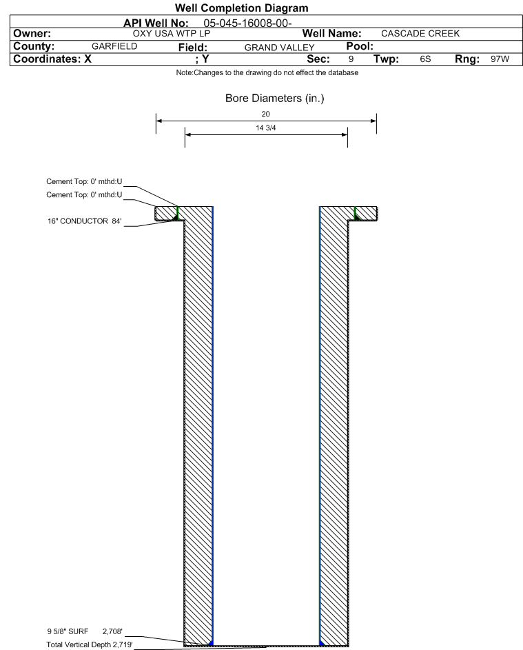 | Wellbore Completed | | Completion Date: | N/A | | Spud Date: | 11/28/2008 | Spud Date Is: | ACTUAL | | Measured TD: | 2750 ft. | Measured PB depth: | | | True Vertical TD: | 2719 ft. | True Vertical PB depth: | | | Bottom Hole Location: | Sec:9 Twp: 6S 97W | Footage: 1718 FSL 1698 FEL | | Log Types: | NONE | | Casing: | String Type: CONDUCTOR, Hole Size: 20 in., Size: 16 in., Top: 0 ft., Depth: 84 ft., Weight: 55 , Citings Type: ACTUAL | | Cement: | Sacks: , Top: 0 ft., Bottom: 84 ft., Determination Method: CALC | | Casing: | String Type: SURF, Hole Size: 14.75 in., Size: 9.625 in., Top: 0 ft., Depth: 2708 ft., Weight: 36 , Citings Type: ACTUAL | | Cement: | Sacks: 2570, Top: 0 ft., Bottom: 2708 ft., Determination Method: CALC | | Formation | Interval Top | Log Bottom | Cored | DSTs | | CAMEO | | | N | N | | COZZETTE | | | N | N | | FORT UNION | | | N | N | | MESAVERDE | | | N | N | | WILLIAMS FORK | | | N | N | | WASATCH G | | | N | N | | No formation data to display. |