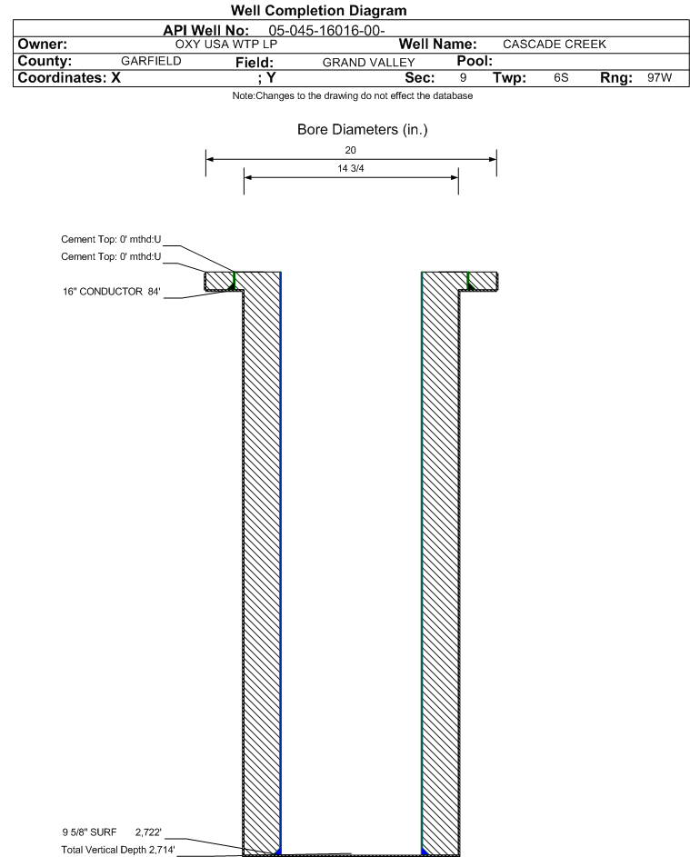 Wellbore #00 Wellbore Classification: GW Status: PA - 8/17/1960 Measured TD: 2750 ft. Vertical TD: 2714 ft.| Wellbore Data for Original Wellbore | Wellbore Classification: GW PA - 8/17/1960 | | Wellbore Permit | DIRECTIONAL | | Permit #: | 20092357 | Expiration Date: | 6/18/2010 | | Proposed Top PZ Location: | Sec: Twp: | Footage: 913 FNL 2441 FEL | | Bottom Hole Location: | Sec:16 Twp: 6S 97W | Footage: 1038 FNL 2462 FEL | | Proposed Depth/Form: | 8880 ft. | | Surface Mineral Owner Same: | Yes | | Mineral Owner: | FEE | Surface Owner: | FEE | | Unit: | | Unit Number: | | | Formation And Spacing: | Code: WMFK , Formation: WILLIAMS FORK , Order: 510-15 , Unit Acreage: , Drill Unit: | | Casing: | String Type: 1ST, Hole Size: 8.75 in., Size: 4.5 in., Top: , Depth: 8880 ft., Weight: 11.6 , Citings Type: PLANNED | | Cement: | Sacks: 1014, Top: 5360 ft., Bottom: 8880 ft. |