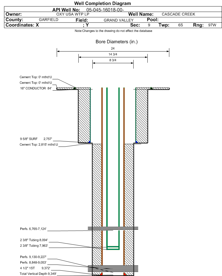 Formation COZZ Formation Classification: GW Status: AB - 1/28/2011 Interval Top: 8848 ft. Interval Bottom: 9053 ft.| Completed Information for Formation COZZETTE | | 1st Production Date: | 5/10/2010 | Choke Size: | 0.000 in. | | Formation Name: | COZZETTE | Commingled: | No | | Production Method: | | | Open Hole Completion: | No |