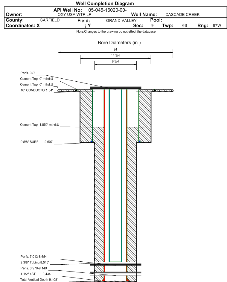 Wellbore #00 Wellbore Classification: GW Status: PR - 11/1/2020 Measured TD: 9470 ft. Vertical TD: 9408 ft.| Wellbore Data for Original Wellbore | Wellbore Classification: GW PR - 11/1/2020 | | Wellbore Permit | DIRECTIONAL | | Permit #: | 20082561 | Expiration Date: | 6/10/2009 | | Proposed Top PZ Location: | Sec: Twp: | Footage: 564 FSL 1499 FEL | | Bottom Hole Location: | Sec:9 Twp: 6S 97W | Footage: 564 FSL 1499 FEL | | Proposed Depth/Form: | 9460 ft. | | Surface Mineral Owner Same: | Yes | | Mineral Owner: | FEE | Surface Owner: | FEE | | Unit: | | Unit Number: | | | Formation And Spacing: | Code: COZZ , Formation: COZZETTE , Order: , Unit Acreage: , Drill Unit: | | Formation And Spacing: | Code: CRCRN , Formation: CORCORAN , Order: , Unit Acreage: , Drill Unit: | | Formation And Spacing: | Code: WMFK , Formation: WILLIAMS FORK , Order: 510-15 , Unit Acreage: , Drill Unit: | | Casing: | String Type: CONDUCTOR, Hole Size: 20 in., Size: 16 in., Top: , Depth: 80 ft., Weight: 65 , Citings Type: PLANNED | | Cement: | Sacks: , Top: 0 ft., Bottom: 80 ft. | | Casing: | String Type: SURF, Hole Size: 12.25 in., Size: 9.625 in., Top: , Depth: 2750 ft., Weight: 36 , Citings Type: PLANNED | | Cement: | Sacks: 1416, Top: 0 ft., Bottom: 2750 ft. | | Casing: | String Type: 1ST, Hole Size: 8.75 in., Size: 4.5 in., Top: , Depth: 9460 ft., Weight: 11.6 , Citings Type: PLANNED | | Cement: | Sacks: 986, Top: 5460 ft., Bottom: 9460 ft. |