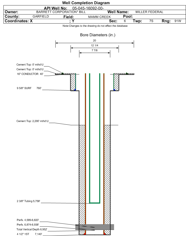 Wellbore #00 Wellbore Classification: GW Status: PR - 1/28/2009 Measured TD: 7160 ft. Vertical TD: 6952 ft.| Wellbore Data for Original Wellbore | Wellbore Classification: GW PR - 1/28/2009 | | Wellbore Permit | DIRECTIONAL | | Permit #: | 20083470 | Expiration Date: | 6/19/2009 | | Proposed Top PZ Location: | Sec: Twp: | Footage: 1529 FSL 2025 FWL | | Bottom Hole Location: | Sec:6 Twp: 7S 91W | Footage: 1529 FSL 2025 FWL | | Proposed Depth/Form: | 7076 ft. | | Surface Mineral Owner Same: | No | | Mineral Owner: | FEDERAL | Surface Owner: | FEE | | Unit: | | Unit Number: | | | Formation And Spacing: | Code: ILES , Formation: ILES , Order: 191-10 , Unit Acreage: , Drill Unit: | | Formation And Spacing: | Code: WMFK , Formation: WILLIAMS FORK , Order: 191-32 , Unit Acreage: , Drill Unit: |