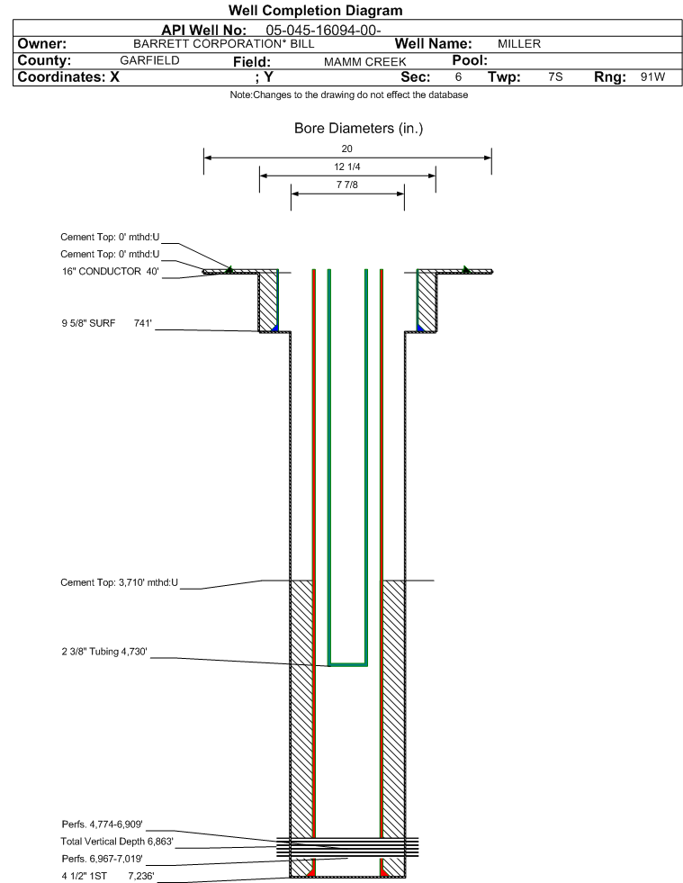 Wellbore #00 Wellbore Classification: GW Status: PR - 12/30/2008 Measured TD: 7250 ft. Vertical TD: 6863 ft.| Wellbore Data for Original Wellbore | Wellbore Classification: GW PR - 12/30/2008 | | Wellbore Permit | DIRECTIONAL | | Permit #: | 20082969 | Expiration Date: | 6/19/2009 | | Proposed Top PZ Location: | Sec: Twp: | Footage: 565 FSL 2025 FEL | | Bottom Hole Location: | Sec:6 Twp: 7S 91W | Footage: 565 FSL 2025 FEL | | Proposed Depth/Form: | 7082 ft. | | Surface Mineral Owner Same: | No | | Mineral Owner: | FEE | Surface Owner: | FEE | | Unit: | | Unit Number: | | | Formation And Spacing: | Code: ILES , Formation: ILES , Order: 191-10 , Unit Acreage: , Drill Unit: | | Formation And Spacing: | Code: WMFK , Formation: WILLIAMS FORK , Order: 191-8 , Unit Acreage: , Drill Unit: |