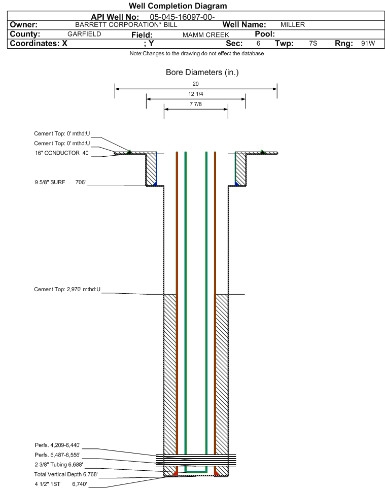 Wellbore #00 Wellbore Classification: GW Status: PR - 12/28/2008 Measured TD: 6775 ft. Vertical TD: 6768 ft.| Wellbore Data for Original Wellbore | Wellbore Classification: GW PR - 12/28/2008 | | Wellbore Permit | DIRECTIONAL | | Permit #: | 20082964 | Expiration Date: | 6/19/2009 | | Proposed Top PZ Location: | Sec: Twp: | Footage: 205 FSL 2025 FWL | | Bottom Hole Location: | Sec:6 Twp: 7S 91W | Footage: 205 FSL 2025 FWL | | Proposed Depth/Form: | 6728 ft. | | Surface Mineral Owner Same: | No | | Mineral Owner: | FEE | Surface Owner: | FEE | | Unit: | | Unit Number: | | | Formation And Spacing: | Code: ILES , Formation: ILES , Order: 191-10 , Unit Acreage: , Drill Unit: | | Formation And Spacing: | Code: WMFK , Formation: WILLIAMS FORK , Order: 191-8 , Unit Acreage: , Drill Unit: |