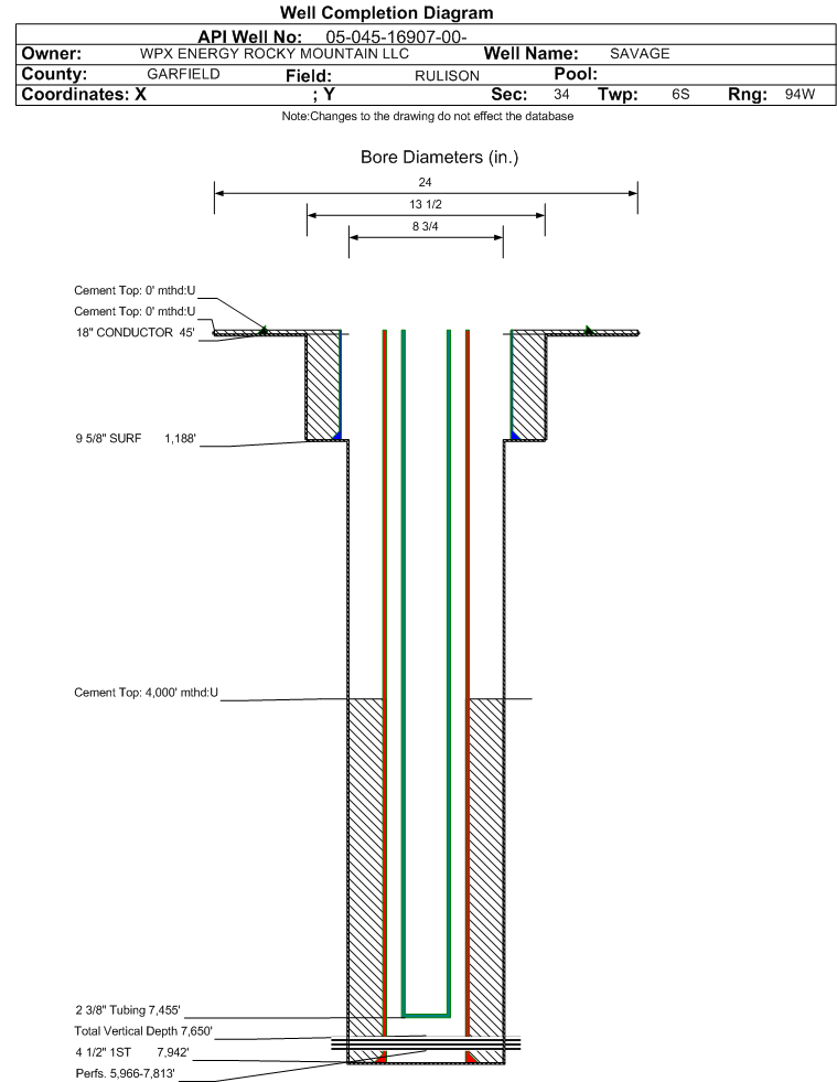 Wellbore #00 Wellbore Classification: GW Status: PR - 9/20/2010 Measured TD: 7960 ft. Vertical TD: 7650 ft.| Wellbore Data for Original Wellbore | Wellbore Classification: GW PR - 9/20/2010 | | Wellbore Permit | DIRECTIONAL | | Permit #: | 20091083 | Expiration Date: | 7/12/2010 | | Proposed Top PZ Location: | Sec: Twp: | Footage: 2099 FSL 1945 FEL | | Bottom Hole Location: | Sec:34 Twp: 6S 94W | Footage: 2099 FSL 1945 FEL | | Proposed Depth/Form: | 8179 ft. | | Surface Mineral Owner Same: | No | | Mineral Owner: | FEE | Surface Owner: | FEE | | Unit: | | Unit Number: | | | Formation And Spacing: | Code: WMFK , Formation: WILLIAMS FORK , Order: 139-66 , Unit Acreage: 640, Drill Unit: ALL |