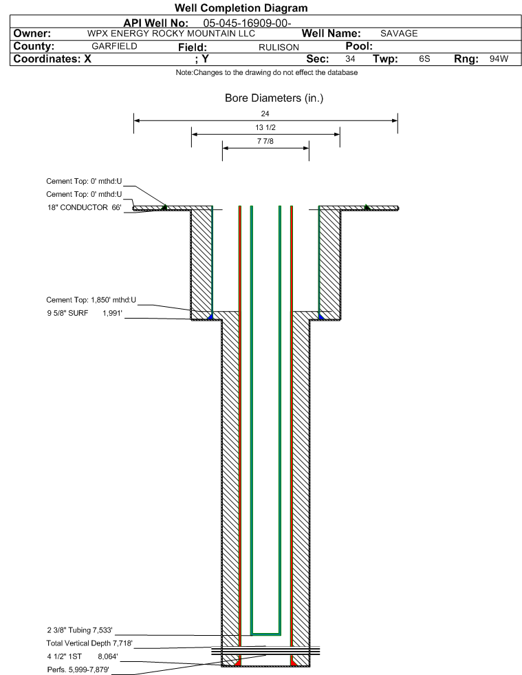 Wellbore #00 Wellbore Classification: GW Status: PR - 6/1/2011 Measured TD: 8108 ft. Vertical TD: 7718 ft.| Wellbore Data for Original Wellbore | Wellbore Classification: GW PR - 6/1/2011 | | Wellbore Permit | DIRECTIONAL | | Permit #: | 20091086 | Expiration Date: | 7/12/2010 | | Proposed Top PZ Location: | Sec: Twp: | Footage: 1959 FSL 694 FEL | | Bottom Hole Location: | Sec:34 Twp: 6S 94W | Footage: 1959 FSL 694 FEL | | Proposed Depth/Form: | 8231 ft. | | Surface Mineral Owner Same: | Yes | | Mineral Owner: | FEE | Surface Owner: | FEE | | Unit: | | Unit Number: | | | Formation And Spacing: | Code: WMFK , Formation: WILLIAMS FORK , Order: 139-66 , Unit Acreage: 640, Drill Unit: ALL | | Casing: | String Type: CONDUCTOR, Hole Size: 24 in., Size: 18 in., Top: , Depth: 45 ft., Weight: 48 , Citings Type: PLANNED | | Cement: | Sacks: , Top: 0 ft., Bottom: 45 ft. | | Casing: | String Type: SURF, Hole Size: 13.5 in., Size: 9.625 in., Top: , Depth: 1918 ft., Weight: 32.3 , Citings Type: PLANNED | | Cement: | Sacks: , Top: 0 ft., Bottom: 1918 ft. | | Casing: | String Type: 1ST, Hole Size: 7.875 in., Size: 4.5 in., Top: , Depth: 8231 ft., Weight: 11.6 , Citings Type: PLANNED | | Cement: | Sacks: , Top: , Bottom: |