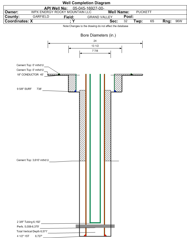 Wellbore #00 Wellbore Classification: GW Status: PR - 6/3/2008 Measured TD: 6739 ft. Vertical TD: 6571 ft.| Wellbore Data for Original Wellbore | Wellbore Classification: GW PR - 6/3/2008 | | Wellbore Permit | DIRECTIONAL | | Permit #: | 20083752 | Expiration Date: | 8/12/2009 | | Proposed Top PZ Location: | Sec: Twp: | Footage: 1425 FSL 2410 FWL | | Bottom Hole Location: | Sec:32 Twp: 6S 96W | Footage: 1425 FSL 2410 FWL | | Proposed Depth/Form: | 6722 ft. | | Surface Mineral Owner Same: | Yes | | Mineral Owner: | FEE | Surface Owner: | FEE | | Unit: | | Unit Number: | | | Formation And Spacing: | Code: WMFK , Formation: WILLIAMS FORK , Order: 510-8 , Unit Acreage: 320, Drill Unit: W/2 32 |