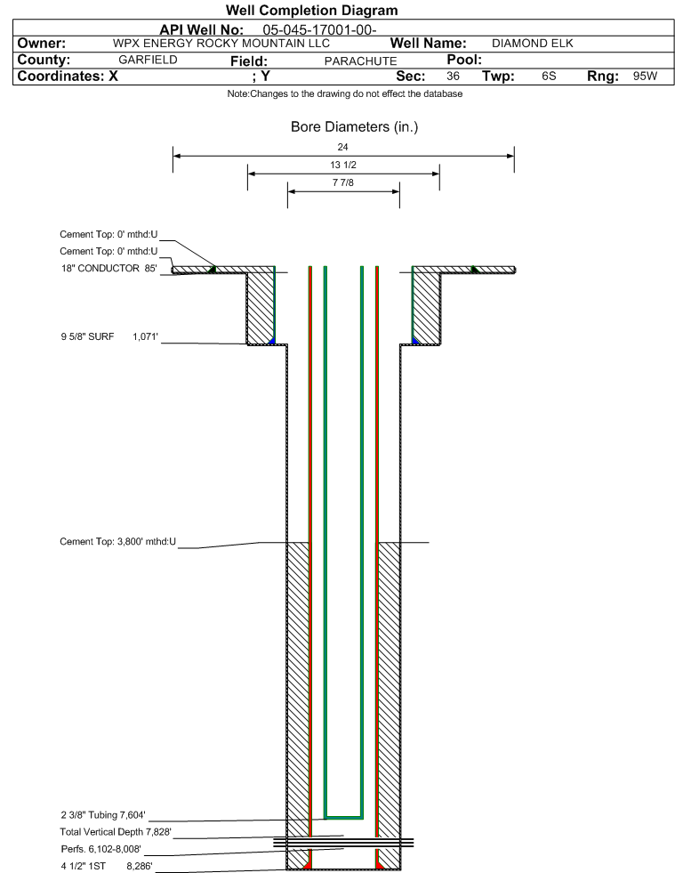 | Wellbore Completed | | Completion Date: | 8/16/2009 | | Spud Date: | 8/9/2009 | Spud Date Is: | ACTUAL | | Measured TD: | 8296 ft. | Measured PB depth: | 8250 ft. | | True Vertical TD: | 7828 ft. | True Vertical PB depth: | 7782 ft. | | Top PZ Location: | Sec:36 Twp: 6S 95W | Footage: 888 FSL 243 FEL | | Bottom Hole Location: | Sec:36 Twp: 6S 95W | Footage: 888 FSL 243 FEL | | Log Types: | CBL; RPM, MUD | | Casing: | String Type: CONDUCTOR, Hole Size: 24 in., Size: 18 in., Top: 0 ft., Depth: 85 ft., Weight: , Citings Type: ACTUAL | | Cement: | Sacks: , Top: 0 ft., Bottom: 85 ft., Determination Method: | | Casing: | String Type: SURF, Hole Size: 13.5 in., Size: 9.625 in., Top: 0 ft., Depth: 1071 ft., Weight: , Citings Type: ACTUAL | | Cement: | Sacks: 310, Top: 0 ft., Bottom: 1071 ft., Determination Method: | | Casing: | String Type: 1ST, Hole Size: 7.875 in., Size: 4.5 in., Top: 0 ft., Depth: 8286 ft., Weight: , Citings Type: ACTUAL | | Cement: | Sacks: 990, Top: 3800 ft., Bottom: 8283 ft., Determination Method: CBL | | Formation | Interval Top | Log Bottom | Cored | DSTs | | WASATCH G | 1947 ft. | | N | N | | MESAVERDE | 4656 ft. | | N | N | | CAMEO | 7197 ft. | | N | N | | ROLLINS | 8182 ft. | | N | N |