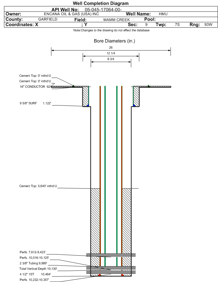 | Wellbore Completed | | Completion Date: | 2/11/2009 | | Spud Date: | 1/25/2009 | Spud Date Is: | ACTUAL | | Measured TD: | 10481 ft. | Measured PB depth: | 10358 ft. | | True Vertical TD: | 10130 ft. | True Vertical PB depth: | 10007 ft. | | Top PZ Location: | Sec:9 Twp: 7S 93W | Footage: 2113 FNL 2222 FEL | | Bottom Hole Location: | Sec:9 Twp: 7S 93W | Footage: 2113 FNL 2222 FEL | | Log Types: | RST, CBL, TEMP | | Casing: | String Type: CONDUCTOR, Hole Size: 26 in., Size: 16 in., Top: 0 ft., Depth: 62 ft., Weight: , Citings Type: ACTUAL | | Cement: | Sacks: 100, Top: 0 ft., Bottom: 40 ft., Determination Method: | | Casing: | String Type: SURF, Hole Size: 12.25 in., Size: 9.625 in., Top: 0 ft., Depth: 1122 ft., Weight: , Citings Type: ACTUAL | | Cement: | Sacks: 375, Top: 0 ft., Bottom: 1122 ft., Determination Method: | | Casing: | String Type: 1ST, Hole Size: 8.75 in., Size: 4.5 in., Top: 0 ft., Depth: 10464 ft., Weight: , Citings Type: ACTUAL | | Cement: | Sacks: 1170, Top: 5640 ft., Bottom: 10481 ft., Determination Method: CBL | | Formation | Interval Top | Log Bottom | Cored | DSTs | | WASATCH | 0 ft. | 5847 ft. | N | N | | OHIO CREEK | 5849 ft. | 6535 ft. | N | N | | WILLIAMS FORK | 6536 ft. | 9535 ft. | N | N | | ROLLINS | 9536 ft. | 10000 ft. | N | N | | COZZETTE | 10001 ft. | 10226 ft. | N | N | | CORCORAN | 10227 ft. | 10481 ft. | N | N |