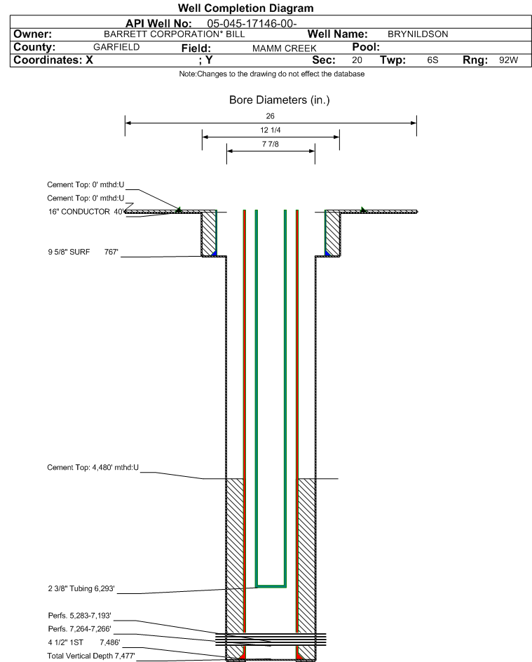Wellbore #00 Wellbore Classification: GW Status: PR - 6/3/2009 Measured TD: 7526 ft. Vertical TD: 7477 ft.| Wellbore Data for Original Wellbore | Wellbore Classification: GW PR - 6/3/2009 | | Wellbore Permit | DIRECTIONAL | | Permit #: | 20084541 | Expiration Date: | 9/15/2009 | | Proposed Top PZ Location: | Sec: Twp: | Footage: 200 FSL 605 FWL | | Bottom Hole Location: | Sec:20 Twp: 6S 92W | Footage: 200 FSL 605 FWL | | Proposed Depth/Form: | 7313 ft. | | Surface Mineral Owner Same: | No | | Mineral Owner: | FEE | Surface Owner: | FEE | | Unit: | | Unit Number: | | | Formation And Spacing: | Code: ILES , Formation: ILES , Order: 191-10 , Unit Acreage: 640, Drill Unit: ALL | | Formation And Spacing: | Code: WMFK , Formation: WILLIAMS FORK , Order: 191-8 , Unit Acreage: 640, Drill Unit: ALL |