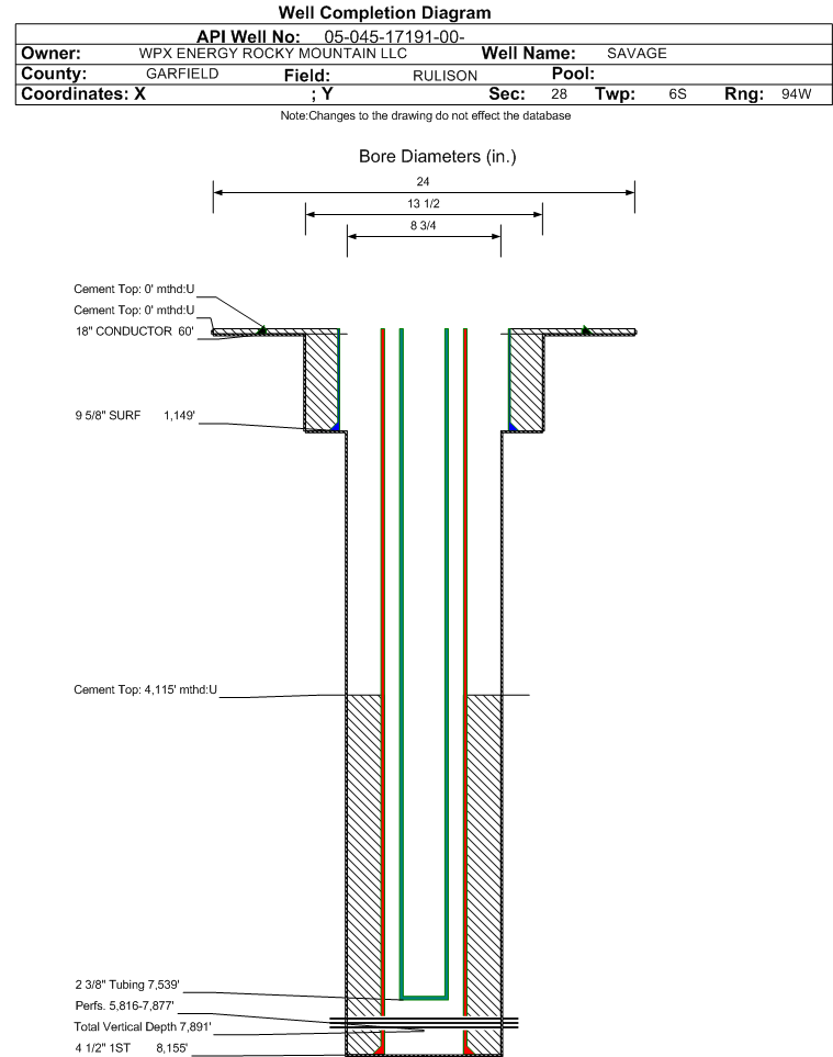 Wellbore #00 Wellbore Classification: GW Status: PR - 12/31/2009 Measured TD: 8175 ft. Vertical TD: 7891 ft.| Wellbore Data for Original Wellbore | Wellbore Classification: GW PR - 12/31/2009 | | Wellbore Permit | DIRECTIONAL | | Permit #: | 20084758 | Expiration Date: | 9/17/2009 | | Proposed Top PZ Location: | Sec: Twp: | Footage: 1332 FSL 1985 FWL | | Bottom Hole Location: | Sec:28 Twp: 6S 94W | Footage: 1332 FSL 1985 FWL | | Proposed Depth/Form: | 8139 ft. | | Surface Mineral Owner Same: | Yes | | Mineral Owner: | FEE | Surface Owner: | FEE | | Unit: | | Unit Number: | | | Formation And Spacing: | Code: WMFK , Formation: WILLIAMS FORK , Order: 139-64 , Unit Acreage: 320, Drill Unit: W/2 |