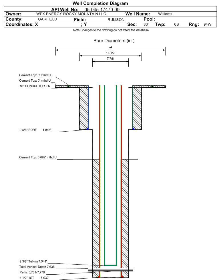 Wellbore #00 Wellbore Classification: GW Status: PR - 10/10/2013 Measured TD: 8045 ft. Vertical TD: 7638 ft.| Wellbore Data for Original Wellbore | Wellbore Classification: GW PR - 10/10/2013 | | Wellbore Permit | DIRECTIONAL | | Permit #: | | Expiration Date: | 10/27/2013 | | Proposed Top PZ Location: | Sec:34 Twp: 6S 94W | Footage: 634 FNL 730 FWL | | Bottom Hole Location: | Sec:34 Twp: 6S 94W | Footage: 634 FNL 730 FWL | | Proposed Depth/Form: | 8010 ft. | | Surface Mineral Owner Same: | No | | Mineral Owner: | FEE | Surface Owner: | FEE | | Unit: | | Unit Number: | | | Formation And Spacing: | Code: WMFK , Formation: WILLIAMS FORK , Order: 139-64 , Unit Acreage: 320, Drill Unit: W/2W/2 | | Casing: | String Type: CONDUCTOR, Hole Size: 24 in., Size: 18 in., Top: 0 ft., Depth: 45 ft., Weight: 48 , Citings Type: PLANNED | | Cement: | Sacks: 50, Top: 0 ft., Bottom: 45 ft. | | Casing: | String Type: SURF, Hole Size: 13.5 in., Size: 9.625 in., Top: 0 ft., Depth: 1792 ft., Weight: 32.3 , Citings Type: PLANNED | | Cement: | Sacks: 462, Top: 0 ft., Bottom: 1792 ft. | | Casing: | String Type: 1ST, Hole Size: 7.875 in., Size: 4.5 in., Top: 0 ft., Depth: 8010 ft., Weight: 11.6 , Citings Type: PLANNED | | Cement: | Sacks: 694, Top: 0 ft., Bottom: 8010 ft. |