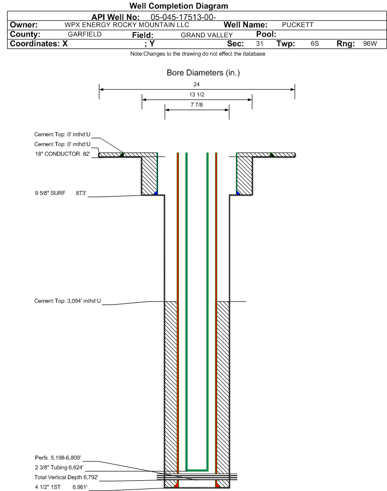 | Wellbore Completed | | Completion Date: | 6/4/2009 | | Spud Date: | 5/27/2009 | Spud Date Is: | ACTUAL | | Measured TD: | 6980 ft. | Measured PB depth: | 6930 ft. | | True Vertical TD: | 6792 ft. | True Vertical PB depth: | 6742 ft. | | Top PZ Location: | Sec:32 Twp: 6S 96W | Footage: 2066 FNL 743 FWL | | Bottom Hole Location: | Sec:32 Twp: 6S 96W | Footage: 2066 FNL 743 FWL | | Log Types: | CBL, RMTE, MUD | | Casing: | String Type: CONDUCTOR, Hole Size: 24 in., Size: 18 in., Top: 0 ft., Depth: 82 ft., Weight: , Citings Type: ACTUAL | | Cement: | Sacks: , Top: 0 ft., Bottom: 82 ft., Determination Method: | | Casing: | String Type: SURF, Hole Size: 13.5 in., Size: 9.625 in., Top: 0 ft., Depth: 873 ft., Weight: , Citings Type: ACTUAL | | Cement: | Sacks: 250, Top: 0 ft., Bottom: 873 ft., Determination Method: | | Casing: | String Type: 1ST, Hole Size: 7.875 in., Size: 4.5 in., Top: 0 ft., Depth: 6961 ft., Weight: , Citings Type: ACTUAL | | Cement: | Sacks: 700, Top: 3094 ft., Bottom: 6961 ft., Determination Method: CBL | | Formation | Interval Top | Log Bottom | Cored | DSTs | | WASATCH G | 2224 ft. | | N | N | | MESAVERDE | 3884 ft. | | N | N | | CAMEO | 6409 ft. | | N | N | | ROLLINS | 6876 ft. | | N | N |