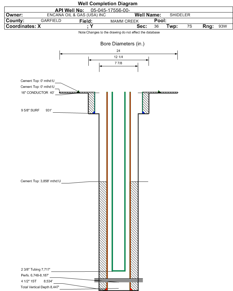 | Wellbore Completed | | Completion Date: | 1/17/2009 | | Spud Date: | 1/8/2009 | Spud Date Is: | ACTUAL | | Measured TD: | 8550 ft. | Measured PB depth: | 8486 ft. | | True Vertical TD: | 8447 ft. | True Vertical PB depth: | 8383 ft. | | Top PZ Location: | Sec:36 Twp: 7S 93W | Footage: 676 FSL 1965 FEL | | Bottom Hole Location: | Sec:36 Twp: 7S 93W | Footage: 676 FSL 1965 FEL | | Log Types: | RST,CBL | | Casing: | String Type: CONDUCTOR, Hole Size: 24 in., Size: 16 in., Top: 0 ft., Depth: 40 ft., Weight: , Citings Type: ACTUAL | | Cement: | Sacks: 100, Top: 0 ft., Bottom: 40 ft., Determination Method: | | Casing: | String Type: SURF, Hole Size: 12.25 in., Size: 9.625 in., Top: 0 ft., Depth: 931 ft., Weight: , Citings Type: ACTUAL | | Cement: | Sacks: 320, Top: 0 ft., Bottom: 931 ft., Determination Method: | | Casing: | String Type: 1ST, Hole Size: 7.875 in., Size: 4.5 in., Top: 0 ft., Depth: 8534 ft., Weight: , Citings Type: ACTUAL | | Cement: | Sacks: 695, Top: 3858 ft., Bottom: 8534 ft., Determination Method: CBL | | Formation | Interval Top | Log Bottom | Cored | DSTs | | WASATCH | 0 ft. | 4829 ft. | N | N | | OHIO CREEK | 4830 ft. | 5568 ft. | N | N | | WILLIAMS FORK | 5569 ft. | 8374 ft. | N | N | | ROLLINS | 8375 ft. | 8550 ft. | N | N |