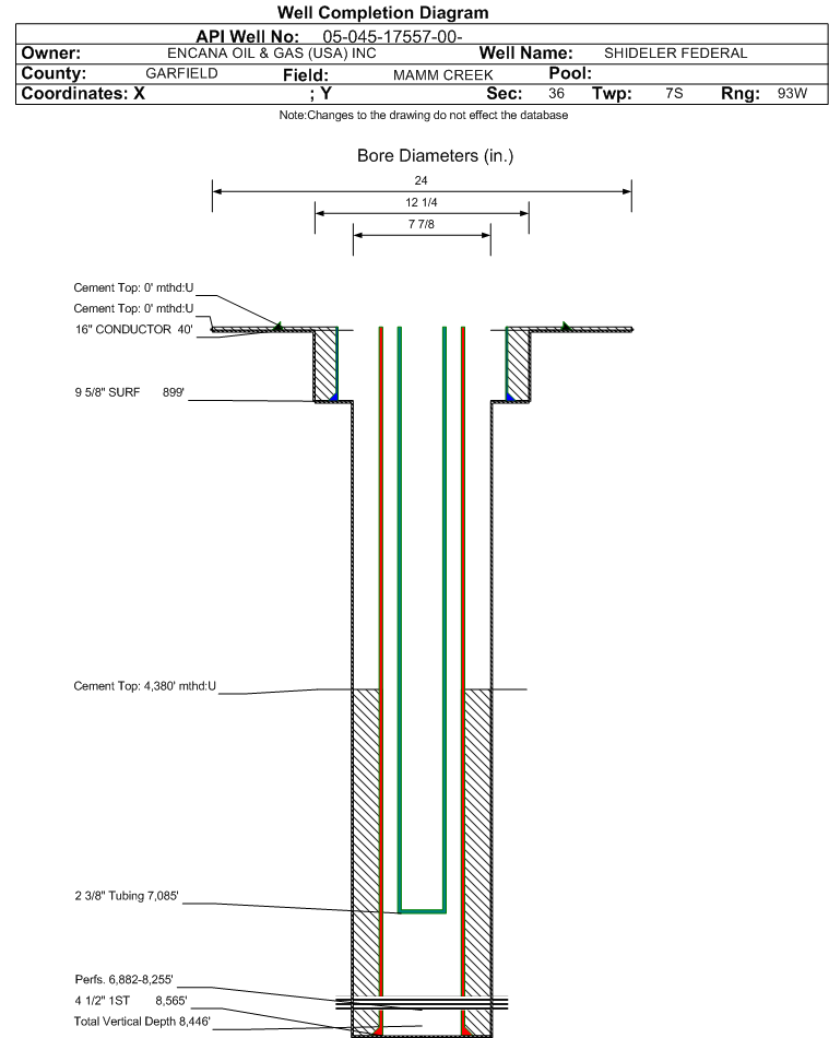 | Wellbore Completed | | Completion Date: | 1/7/2009 | | Spud Date: | 12/26/2008 | Spud Date Is: | ACTUAL | | Measured TD: | 8580 ft. | Measured PB depth: | 8522 ft. | | True Vertical TD: | 8446 ft. | True Vertical PB depth: | 8388 ft. | | Top PZ Location: | Sec:36 Twp: 7S 93W | Footage: 277 FSL 1971 FEL | | Bottom Hole Location: | Sec:36 Twp: 7S 93W | Footage: 277 FSL 1971 FEL | | Log Types: | RST, CBL, AIL | | Casing: | String Type: CONDUCTOR, Hole Size: 24 in., Size: 16 in., Top: 0 ft., Depth: 40 ft., Weight: , Citings Type: ACTUAL | | Cement: | Sacks: 100, Top: 0 ft., Bottom: 40 ft., Determination Method: | | Casing: | String Type: SURF, Hole Size: 12.25 in., Size: 9.625 in., Top: 0 ft., Depth: 899 ft., Weight: , Citings Type: ACTUAL | | Cement: | Sacks: 320, Top: 0 ft., Bottom: 887 ft., Determination Method: | | Casing: | String Type: 1ST, Hole Size: 7.875 in., Size: 4.5 in., Top: 0 ft., Depth: 8565 ft., Weight: , Citings Type: ACTUAL | | Cement: | Sacks: 695, Top: 4380 ft., Bottom: 8565 ft., Determination Method: CBL | | Formation | Interval Top | Log Bottom | Cored | DSTs | | WASATCH | 0 ft. | 4845 ft. | N | N | | OHIO CREEK | 4846 ft. | 5630 ft. | N | N | | WILLIAMS FORK | 5631 ft. | 8462 ft. | N | N | | ROLLINS | 8463 ft. | 8580 ft. | N | N |