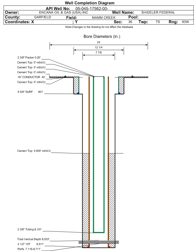 | Wellbore Completed | | Completion Date: | 11/10/2008 | | Spud Date: | 10/27/2009 | Spud Date Is: | ACTUAL | | Measured TD: | 8925 ft. | Measured PB depth: | 8864 ft. | | True Vertical TD: | 8533 ft. | True Vertical PB depth: | 8472 ft. | | Top PZ Location: | Sec:1 Twp: 8S 93W | Footage: 655 FNL 1939 FEL | | Bottom Hole Location: | Sec:1 Twp: 8S 93W | Footage: 655 FNL 1939 FEL | | Log Types: | CBL, RST | | Casing: | String Type: CONDUCTOR, Hole Size: 24 in., Size: 16 in., Top: 0 ft., Depth: 40 ft., Weight: , Citings Type: ACTUAL | | Cement: | Sacks: 100, Top: 0 ft., Bottom: 40 ft., Determination Method: | | Casing: | String Type: SURF, Hole Size: 12.25 in., Size: 9.625 in., Top: 0 ft., Depth: 901 ft., Weight: , Citings Type: ACTUAL | | Cement: | Sacks: 320, Top: 0 ft., Bottom: 915 ft., Determination Method: | | Casing: | String Type: 1ST, Hole Size: 7.875 in., Size: 4.5 in., Top: 0 ft., Depth: 8911 ft., Weight: , Citings Type: ACTUAL | | Cement: | Sacks: 958, Top: 4000 ft., Bottom: 8911 ft., Determination Method: CBL | | Casing: | String Type: 2ND, Hole Size: , Size: , Top: 0 ft., Depth: , Weight: , Citings Type: ACTUAL | | Cement: | Sacks: , Top: , Bottom: , Determination Method: | | Casing: | String Type: 3RD, Hole Size: , Size: , Top: 0 ft., Depth: , Weight: , Citings Type: ACTUAL | | Cement: | Sacks: , Top: , Bottom: , Determination Method: | | Casing: | String Type: 1ST LINER, Hole Size: , Size: , Top: 0 ft., Depth: , Weight: , Citings Type: ACTUAL | | Cement: | Sacks: , Top: , Bottom: , Determination Method: | | Formation | Interval Top | Log Bottom | Cored | DSTs | | WASATCH | 0 ft. | 5032 ft. | N | N | | OHIO CREEK | 5033 ft. | 5944 ft. | N | N | | WILLIAMS FORK | 5945 ft. | 8803 ft. | N | N | | ROLLINS | 8804 ft. | 8945 ft. | N | N |