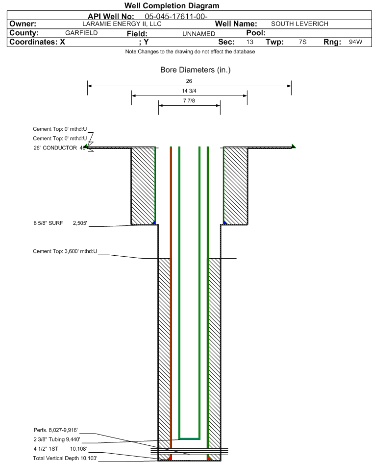 | Wellbore Completed | | Completion Date: | 4/18/2009 | | Spud Date: | 4/3/2009 | Spud Date Is: | ACTUAL | | Measured TD: | 10108 ft. | Measured PB depth: | 10060 ft. | | True Vertical TD: | 10103 ft. | True Vertical PB depth: | 10055 ft. | | Top PZ Location: | Sec:13 Twp: 7S 94W | Footage: 1499 FSL 672 FEL | | Bottom Hole Location: | Sec:13 Twp: 7S 94W | Footage: 1499 FSL 672 FEL | | Log Types: | RMTE, TEMP, CBL, MUD | | Casing: | String Type: CONDUCTOR, Hole Size: 26 in., Size: 26 in., Top: 0 ft., Depth: 40 ft., Weight: , Citings Type: ACTUAL | | Cement: | Sacks: , Top: 0 ft., Bottom: 40 ft., Determination Method: | | Casing: | String Type: SURF, Hole Size: 14.75 in., Size: 8.625 in., Top: 0 ft., Depth: 2505 ft., Weight: , Citings Type: ACTUAL | | Cement: | Sacks: 1100, Top: 0 ft., Bottom: 2505 ft., Determination Method: | | Casing: | String Type: 1ST, Hole Size: 7.875 in., Size: 4.5 in., Top: 0 ft., Depth: 10108 ft., Weight: , Citings Type: ACTUAL | | Cement: | Sacks: 1380, Top: 3600 ft., Bottom: 10108 ft., Determination Method: CBL | | Formation | Interval Top | Log Bottom | Cored | DSTs | | WILLIAMS FORK | 6476 ft. | | N | N | | ROLLINS | 9938 ft. | | N | N |