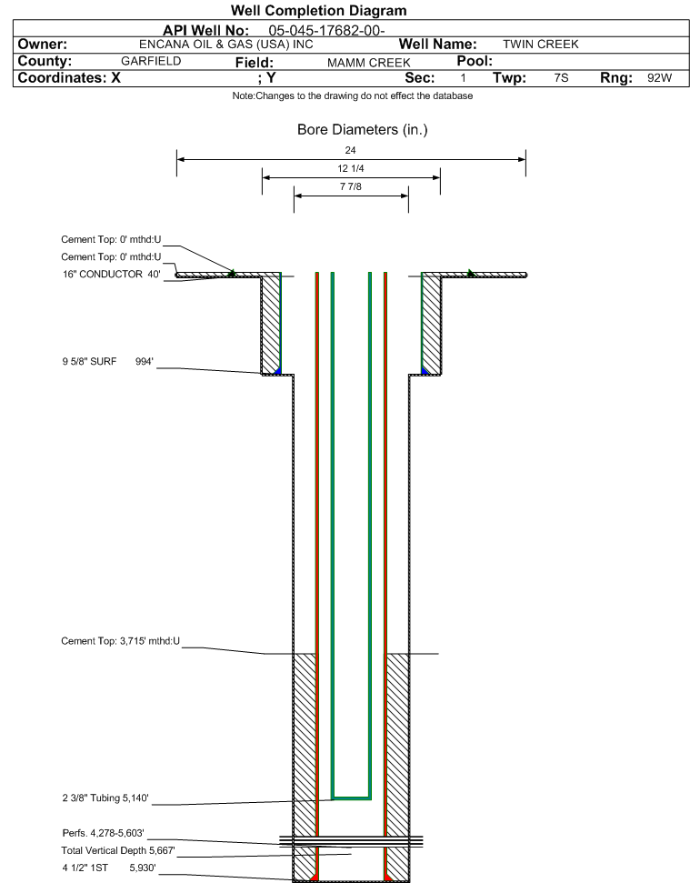| Wellbore Completed | | Completion Date: | 4/20/2009 | | Spud Date: | 4/12/2009 | Spud Date Is: | ACTUAL | | Measured TD: | 5940 ft. | Measured PB depth: | 5882 ft. | | True Vertical TD: | 5667 ft. | True Vertical PB depth: | 5609 ft. | | Top PZ Location: | Sec:1 Twp: 7S 92W | Footage: 64 FSL 1990 FWL | | Bottom Hole Location: | Sec:1 Twp: 7S 92W | Footage: 64 FSL 1990 FWL | | Log Types: | CBL/RST; MUD | | Casing: | String Type: CONDUCTOR, Hole Size: 24 in., Size: 16 in., Top: 0 ft., Depth: 40 ft., Weight: , Citings Type: ACTUAL | | Cement: | Sacks: 100, Top: 0 ft., Bottom: 40 ft., Determination Method: CALC | | Casing: | String Type: SURF, Hole Size: 12.25 in., Size: 9.625 in., Top: 0 ft., Depth: 994 ft., Weight: 36 , Citings Type: ACTUAL | | Cement: | Sacks: 531, Top: 0 ft., Bottom: 1001 ft., Determination Method: CALC | | Casing: | String Type: 1ST, Hole Size: 7.875 in., Size: 4.5 in., Top: 0 ft., Depth: 5930 ft., Weight: 11.6 , Citings Type: ACTUAL | | Cement: | Sacks: 1096, Top: 3715 ft., Bottom: 5930 ft., Determination Method: CALC | | Formation | Interval Top | Log Bottom | Cored | DSTs | | WASATCH | 0 ft. | 3350 ft. | N | N | | WILLIAMS FORK | 3350 ft. | 5940 ft. | N | N |
