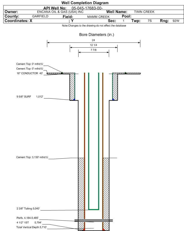 | Wellbore Completed | | Completion Date: | 3/16/2009 | | Spud Date: | 3/7/2009 | Spud Date Is: | ACTUAL | | Measured TD: | 5804 ft. | Measured PB depth: | 5746 ft. | | True Vertical TD: | 5710 ft. | True Vertical PB depth: | 5652 ft. | | Top PZ Location: | Sec:1 Twp: 7S 92W | Footage: 1381 FSL 1965 FWL | | Bottom Hole Location: | Sec:1 Twp: 7S 92W | Footage: 1381 FSL 1965 FWL | | Log Types: | RST/CBL | | Casing: | String Type: CONDUCTOR, Hole Size: 24 in., Size: 16 in., Top: 0 ft., Depth: 40 ft., Weight: , Citings Type: ACTUAL | | Cement: | Sacks: 100, Top: 0 ft., Bottom: 40 ft., Determination Method: CALC | | Casing: | String Type: SURF, Hole Size: 12.25 in., Size: 9.625 in., Top: 0 ft., Depth: 1012 ft., Weight: , Citings Type: ACTUAL | | Cement: | Sacks: 531, Top: 0 ft., Bottom: 1012 ft., Determination Method: CALC | | Casing: | String Type: 1ST, Hole Size: 7.875 in., Size: 4.5 in., Top: 0 ft., Depth: 5794 ft., Weight: , Citings Type: ACTUAL | | Cement: | Sacks: 1234, Top: 3130 ft., Bottom: 5804 ft., Determination Method: CBL | | Formation | Interval Top | Log Bottom | Cored | DSTs | | WASATCH | 0 ft. | 3384 ft. | N | N | | WILLIAMS FORK | 3384 ft. | 5804 ft. | N | N |