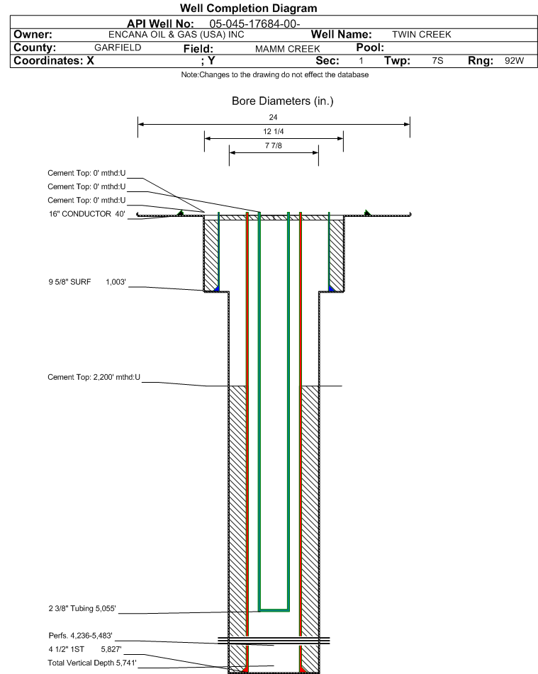 | Wellbore Completed | | Completion Date: | 3/22/2009 | | Spud Date: | 3/16/2009 | Spud Date Is: | ACTUAL | | Measured TD: | 5841 ft. | Measured PB depth: | 5779 ft. | | True Vertical TD: | 5741 ft. | True Vertical PB depth: | 5579 ft. | | Top PZ Location: | Sec:1 Twp: 7S 92W | Footage: 1016 FSL 1958 FWL | | Bottom Hole Location: | Sec:1 Twp: 7S 92W | Footage: 1016 FSL 1958 FWL | | Log Types: | CBL/RST | | Casing: | String Type: CONDUCTOR, Hole Size: 24 in., Size: 16 in., Top: 0 ft., Depth: 40 ft., Weight: , Citings Type: ACTUAL | | Cement: | Sacks: 100, Top: 0 ft., Bottom: 40 ft., Determination Method: CALC | | Casing: | String Type: SURF, Hole Size: 12.25 in., Size: 9.625 in., Top: 0 ft., Depth: 1003 ft., Weight: , Citings Type: ACTUAL | | Cement: | Sacks: 731, Top: 0 ft., Bottom: 1003 ft., Determination Method: CALC | | Casing: | String Type: 1ST, Hole Size: 7.875 in., Size: 4.5 in., Top: 0 ft., Depth: 5827 ft., Weight: , Citings Type: ACTUAL | | Cement: | Sacks: 1016, Top: 2200 ft., Bottom: 5827 ft., Determination Method: CBL | | Casing: | String Type: 2ND, Hole Size: , Size: , Top: 0 ft., Depth: 100 ft., Weight: , Citings Type: ACTUAL | | Cement: | Sacks: 40, Top: 0 ft., Bottom: 40 ft., Determination Method: CALC | | Formation | Interval Top | Log Bottom | Cored | DSTs | | WASATCH | 0 ft. | 3339 ft. | N | N | | WILLIAMS FORK | 3339 ft. | 5841 ft. | N | N |