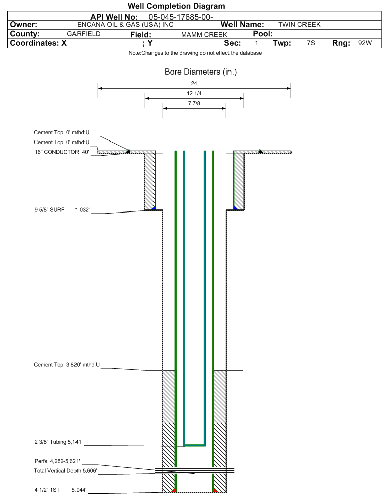 | Wellbore Completed | | Completion Date: | 5/6/2009 | | Spud Date: | 4/21/2009 | Spud Date Is: | ACTUAL | | Measured TD: | 5962 ft. | Measured PB depth: | 5875 ft. | | True Vertical TD: | 5606 ft. | True Vertical PB depth: | 5520 ft. | | Top PZ Location: | Sec:12 Twp: 7S 92W | Footage: 119 FNL 2042 FWL | | Bottom Hole Location: | Sec:12 Twp: 7S 92W | Footage: 119 FNL 2042 FWL | | Log Types: | RST/CBL | | Casing: | String Type: CONDUCTOR, Hole Size: 24 in., Size: 16 in., Top: 0 ft., Depth: 40 ft., Weight: , Citings Type: ACTUAL | | Cement: | Sacks: 100, Top: 0 ft., Bottom: 40 ft., Determination Method: | | Casing: | String Type: SURF, Hole Size: 12.25 in., Size: 9.625 in., Top: 0 ft., Depth: 1032 ft., Weight: , Citings Type: ACTUAL | | Cement: | Sacks: 531, Top: 0 ft., Bottom: 1031 ft., Determination Method: | | Casing: | String Type: 1ST, Hole Size: 7.875 in., Size: 4.5 in., Top: 0 ft., Depth: 5944 ft., Weight: , Citings Type: ACTUAL | | Cement: | Sacks: 1009, Top: 3820 ft., Bottom: 5944 ft., Determination Method: CBL | | Formation | Interval Top | Log Bottom | Cored | DSTs | | WASATCH | 0 ft. | 3334 ft. | N | N | | WILLIAMS FORK | 3334 ft. | 5962 ft. | N | N |