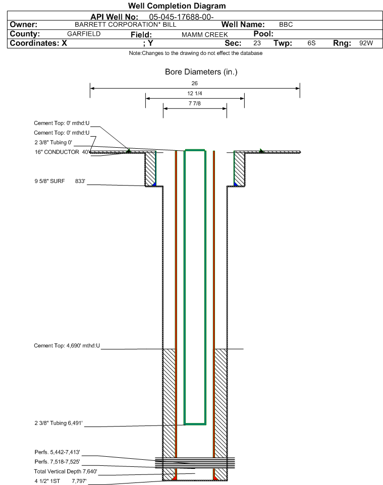 Wellbore #00 Wellbore Classification: GW Status: PR - 9/24/2009 Measured TD: 7810 ft. Vertical TD: 7640 ft.| Wellbore Data for Original Wellbore | Wellbore Classification: GW PR - 9/24/2009 | | Wellbore Permit | DIRECTIONAL | | Permit #: | 20085958 | Expiration Date: | 11/5/2009 | | Proposed Top PZ Location: | Sec: Twp: | Footage: 1835 FNL 664 FWL | | Bottom Hole Location: | Sec:24 Twp: 6S 92W | Footage: 1835 FNL 664 FWL | | Proposed Depth/Form: | 7740 ft. | | Surface Mineral Owner Same: | No | | Mineral Owner: | FEE | Surface Owner: | FEE | | Unit: | | Unit Number: | | | Formation And Spacing: | Code: ILES , Formation: ILES , Order: 191-10 , Unit Acreage: 320, Drill Unit: W2 | | Formation And Spacing: | Code: WMFK , Formation: WILLIAMS FORK , Order: 191-8 , Unit Acreage: 320, Drill Unit: W2 |