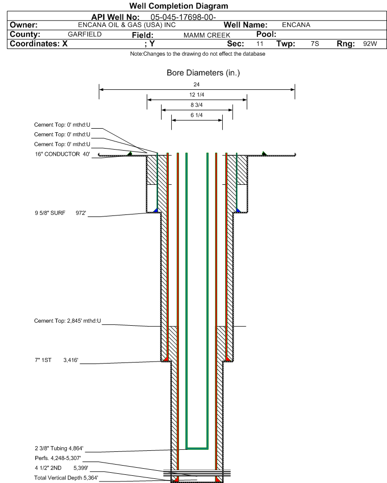 | Wellbore Completed | | Completion Date: | 2/2/2009 | | Spud Date: | 12/29/2008 | Spud Date Is: | ACTUAL | | Measured TD: | 5410 ft. | Measured PB depth: | 5354 ft. | | True Vertical TD: | 5364 ft. | True Vertical PB depth: | 5308 ft. | | Top PZ Location: | Sec:11 Twp: 7S 92W | Footage: 2002 FNL 2005 FWL | | Bottom Hole Location: | Sec:11 Twp: 7S 92W | Footage: 2002 FNL 2005 FWL | | Log Types: | RST, CBL | | Casing: | String Type: CONDUCTOR, Hole Size: 24 in., Size: 16 in., Top: 0 ft., Depth: 40 ft., Weight: , Citings Type: ACTUAL | | Cement: | Sacks: 75, Top: 0 ft., Bottom: 40 ft., Determination Method: CALC | | Casing: | String Type: SURF, Hole Size: 12.25 in., Size: 9.625 in., Top: 0 ft., Depth: 972 ft., Weight: 36 , Citings Type: ACTUAL | | Cement: | Sacks: 492, Top: 0 ft., Bottom: 520 ft., Determination Method: CALC | | Casing: | String Type: 1ST, Hole Size: 8.75 in., Size: 7 in., Top: 0 ft., Depth: 3416 ft., Weight: , Citings Type: ACTUAL | | Cement: | Sacks: 406, Top: 0 ft., Bottom: 3425 ft., Determination Method: CALC | | Casing: | String Type: 2ND, Hole Size: 6.25 in., Size: 4.5 in., Top: 0 ft., Depth: 5399 ft., Weight: 11.6 , Citings Type: ACTUAL | | Cement: | Sacks: 270, Top: 2845 ft., Bottom: 5400 ft., Determination Method: CBL | | Formation | Interval Top | Log Bottom | Cored | DSTs | | WASATCH | 0 ft. | 2994 ft. | N | N | | WILLIAMS FORK | 2994 ft. | 5410 ft. | N | N |