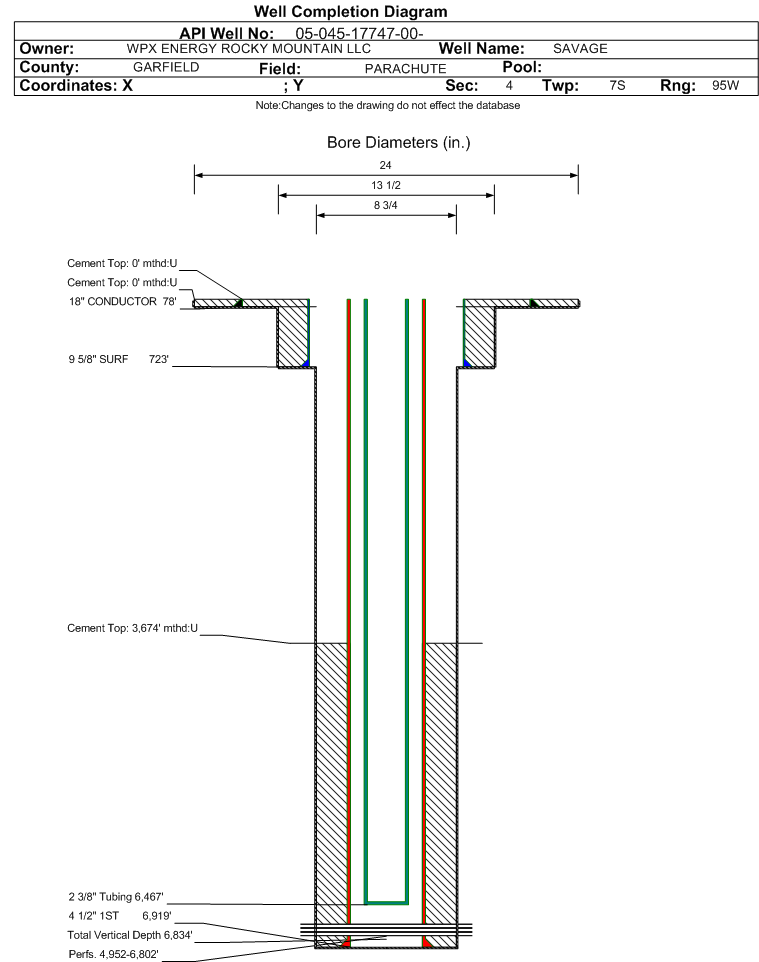 Wellbore #00 Wellbore Classification: GW Status: PR - 4/1/2015 Measured TD: 6940 ft. Vertical TD: 6834 ft.| Wellbore Data for Original Wellbore | Wellbore Classification: GW PR - 4/1/2015 | | Wellbore Permit | DIRECTIONAL | | Permit #: | 20086433 | Expiration Date: | 11/19/2009 | | Proposed Top PZ Location: | Sec:4 Twp: 7S 95W | Footage: 1138 FSL 590 FWL | | Bottom Hole Location: | Sec:4 Twp: 7S 95W | Footage: 1135 FSL 572 FWL | | Proposed Depth/Form: | 6923 ft. | | Surface Mineral Owner Same: | Yes | | Mineral Owner: | FEE | Surface Owner: | FEE | | Unit: | | Unit Number: | | | Formation And Spacing: | Code: WMFK , Formation: WILLIAMS FORK , Order: 440-35 , Unit Acreage: 640, Drill Unit: SEC |