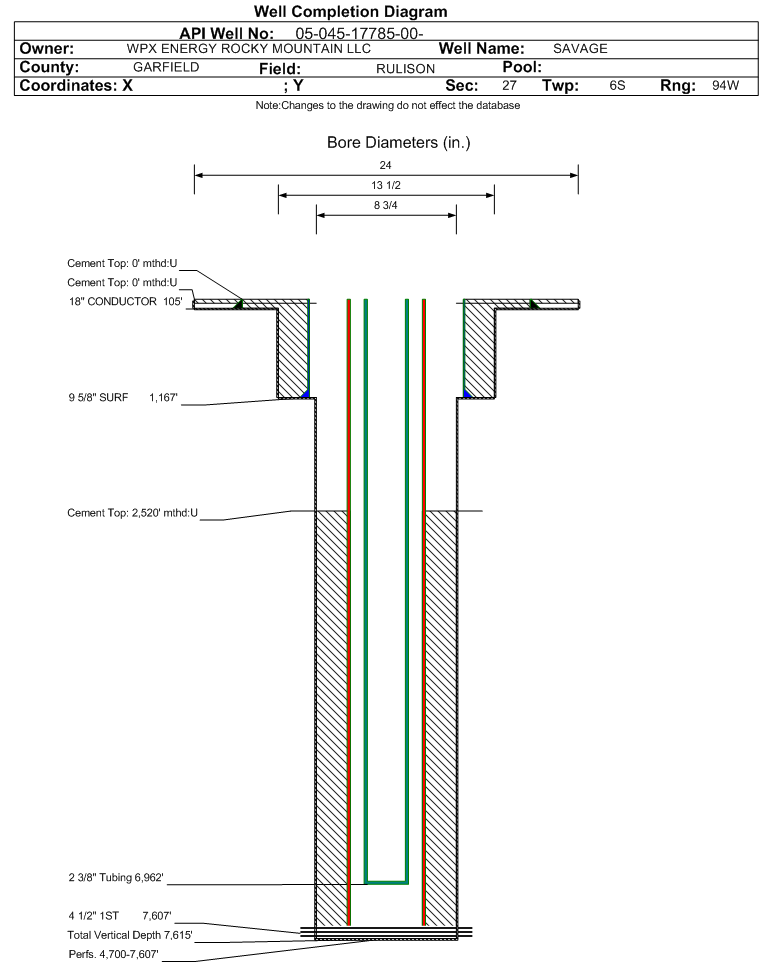 Wellbore #00 Wellbore Classification: GW Status: PR - 4/16/2011 Measured TD: 7635 ft. Vertical TD: 7615 ft.| Wellbore Data for Original Wellbore | Wellbore Classification: GW PR - 4/16/2011 | | Wellbore Permit | DIRECTIONAL | | Permit #: | | Expiration Date: | 1/25/2012 | | Proposed Top PZ Location: | Sec:27 Twp: 6S 94W | Footage: 1908 FSL 2174 FEL | | Bottom Hole Location: | Sec:27 Twp: 6S 94W | Footage: 1908 FSL 2174 FEL | | Proposed Depth/Form: | 7613 ft. | | Surface Mineral Owner Same: | No | | Mineral Owner: | FEE | Surface Owner: | FEE | | Unit: | | Unit Number: | | | Formation And Spacing: | Code: WMFK , Formation: WILLIAMS FORK , Order: 139-66 , Unit Acreage: 320, Drill Unit: E/2 | | Casing: | String Type: CONDUCTOR, Hole Size: 24 in., Size: 18 in., Top: , Depth: 45 ft., Weight: 48 , Citings Type: PLANNED | | Cement: | Sacks: 25, Top: 0 ft., Bottom: 45 ft. | | Casing: | String Type: SURF, Hole Size: 13.5 in., Size: 9.625 in., Top: , Depth: 1100 ft., Weight: 32.3 , Citings Type: PLANNED | | Cement: | Sacks: 390, Top: 0 ft., Bottom: 1100 ft. | | Casing: | String Type: 1ST, Hole Size: 7.875 in., Size: 4.5 in., Top: , Depth: 7613 ft., Weight: 11.6 , Citings Type: PLANNED | | Cement: | Sacks: 700, Top: 200 ft., Bottom: 7613 ft. |