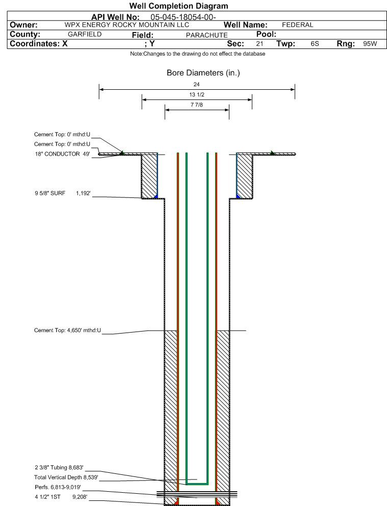 | Wellbore Completed | | Completion Date: | 2/22/2010 | | Spud Date: | 2/11/2010 | Spud Date Is: | ACTUAL | | Measured TD: | 9228 ft. | Measured PB depth: | 9167 ft. | | True Vertical TD: | 8539 ft. | True Vertical PB depth: | 8468 ft. | | Top PZ Location: | Sec:21 Twp: 6S 95W | Footage: 2271 FSL 264 FEL | | Bottom Hole Location: | Sec:21 Twp: 6S 95W | Footage: 2269 FSL 262 FEL | | Log Types: | CBL; RESEVOIR MONITOR TOOL ELITE, MUD | | Log Types: | CBL, MUD, RESERVOIR MONITOR TOOL ELITE | | Casing: | String Type: CONDUCTOR, Hole Size: 24 in., Size: 18 in., Top: 0 ft., Depth: 49 ft., Weight: , Citings Type: ACTUAL | | Cement: | Sacks: 19, Top: 0 ft., Bottom: 49 ft., Determination Method: VISU | | Casing: | String Type: SURF, Hole Size: 13.5 in., Size: 9.625 in., Top: 0 ft., Depth: 1192 ft., Weight: , Citings Type: ACTUAL | | Cement: | Sacks: 350, Top: 0 ft., Bottom: 1192 ft., Determination Method: VISU | | Casing: | String Type: 1ST, Hole Size: 7.875 in., Size: 4.5 in., Top: 0 ft., Depth: 9208 ft., Weight: , Citings Type: ACTUAL | | Cement: | Sacks: 1195, Top: 4650 ft., Bottom: 9208 ft., Determination Method: CBL | | Formation | Interval Top | Log Bottom | Cored | DSTs | | GREELEY SAND | 2615 ft. | | | | | WASATCH G | 2615 ft. | | N | N | | MESAVERDE | 5541 ft. | | | | | CAMEO | 8380 ft. | | | | | ROLLINS | 9124 ft. | | | |