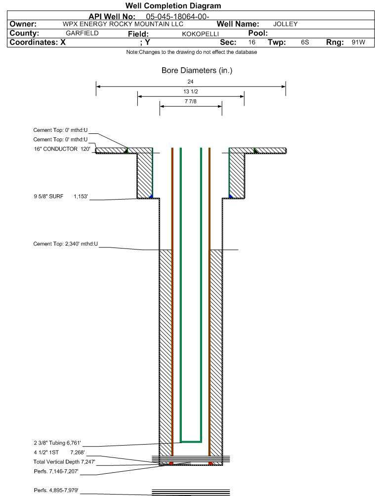 Wellbore #00 Wellbore Classification: GW Status: PR - 1/1/2021 Measured TD: 7288 ft. Vertical TD: 7247 ft.| Wellbore Data for Original Wellbore | Wellbore Classification: GW PR - 1/1/2021 | | Wellbore Permit | DIRECTIONAL | | Permit #: | 20087727 | Expiration Date: | 1/21/2010 | | Proposed Top PZ Location: | Sec: Twp: | Footage: 150 FNL 660 FWL | | Bottom Hole Location: | Sec:16 Twp: 6S 91W | Footage: 150 FNL 660 FWL | | Proposed Depth/Form: | 8061 ft. | | Surface Mineral Owner Same: | Yes | | Mineral Owner: | FEE | Surface Owner: | FEE | | Unit: | | Unit Number: | | | Formation And Spacing: | Code: ILES , Formation: ILES , Order: 513-4 , Unit Acreage: , Drill Unit: | | Formation And Spacing: | Code: WMFK , Formation: WILLIAMS FORK , Order: 513-4 , Unit Acreage: , Drill Unit: | | Casing: | String Type: CONDUCTOR, Hole Size: 24 in., Size: 16 in., Top: , Depth: 70 ft., Weight: 65 , Citings Type: PLANNED | | Cement: | Sacks: 100, Top: 0 ft., Bottom: 70 ft. | | Casing: | String Type: SURF, Hole Size: 12.25 in., Size: 8.625 in., Top: , Depth: 1000 ft., Weight: 32 , Citings Type: PLANNED | | Cement: | Sacks: 570, Top: 0 ft., Bottom: 1000 ft. | | Casing: | String Type: 1ST, Hole Size: 7.875 in., Size: 4.5 in., Top: , Depth: 8061 ft., Weight: 11.6 , Citings Type: PLANNED | | Cement: | Sacks: 1168, Top: 2831 ft., Bottom: 8061 ft. |