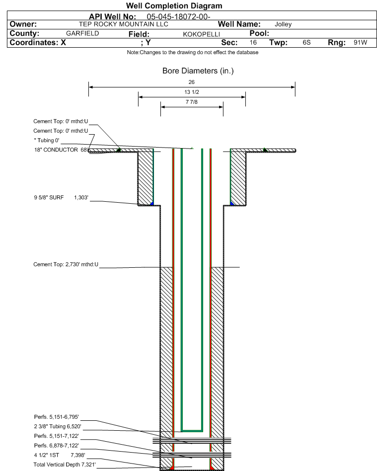 Wellbore #00 Wellbore Classification: GW Status: PR - 3/4/2016 Measured TD: 7415 ft. Vertical TD: 7321 ft.| Wellbore Data for Original Wellbore | Wellbore Classification: GW PR - 3/4/2016 | | Wellbore Permit | DIRECTIONAL | | Permit #: | | Expiration Date: | 12/10/2013 | | Proposed Top PZ Location: | Sec:9 Twp: 6s 91w | Footage: 208 FSL 611 FWL | | Bottom Hole Location: | Sec:9 Twp: 6s 91w | Footage: 240 FSL 620 FWL | | Proposed Depth/Form: | 7394 ft. | | Surface Mineral Owner Same: | Yes | | Mineral Owner: | FEE | Surface Owner: | FEE | | Unit: | | Unit Number: | | | Formation And Spacing: | Code: ILES , Formation: ILES , Order: 513-4 , Unit Acreage: , Drill Unit: | | Formation And Spacing: | Code: WFILS , Formation: WILLIAMS FORK-ILES , Order: 513-4 , Unit Acreage: , Drill Unit: | | Formation And Spacing: | Code: WMFK , Formation: WILLIAMS FORK , Order: 513-4 , Unit Acreage: , Drill Unit: | | Casing: | String Type: CONDUCTOR, Hole Size: 24 in., Size: 16 in., Top: 0 ft., Depth: 70 ft., Weight: 65# , Citings Type: PLANNED | | Cement: | Sacks: 100, Top: 0 ft., Bottom: 70 ft. | | Casing: | String Type: SURF, Hole Size: 13.5 in., Size: 9.625 in., Top: 0 ft., Depth: 1316 ft., Weight: 32.3# , Citings Type: PLANNED | | Cement: | Sacks: 344, Top: 0 ft., Bottom: 1316 ft. | | Casing: | String Type: 1ST, Hole Size: 7.875 in., Size: 4.5 in., Top: 0 ft., Depth: 7394 ft., Weight: 11.6# , Citings Type: PLANNED | | Cement: | Sacks: 724, Top: , Bottom: 7394 ft. |