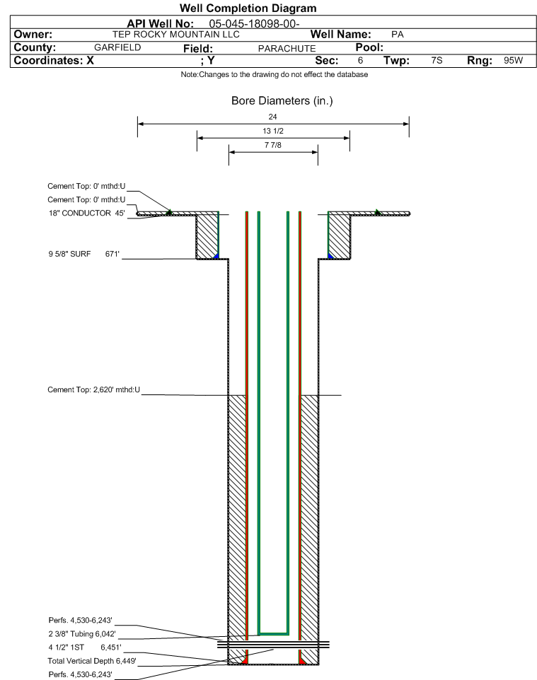 Wellbore #00 Wellbore Classification: GW Status: PR - 7/31/2009 Measured TD: 6477 ft. Vertical TD: 6449 ft.| Wellbore Data for Original Wellbore | Wellbore Classification: GW PR - 7/31/2009 | | Wellbore Permit | DIRECTIONAL | | Permit #: | 20088132 | Expiration Date: | 2/3/2010 | | Proposed Top PZ Location: | Sec: Twp: | Footage: 245 FSL 674 FEL | | Bottom Hole Location: | Sec:6 Twp: 7S 95W | Footage: 245 FSL 674 FWL | | Proposed Depth/Form: | 6484 ft. | | Surface Mineral Owner Same: | Yes | | Mineral Owner: | FEE | Surface Owner: | FEE | | Unit: | | Unit Number: | | | Formation And Spacing: | Code: WMFK , Formation: WILLIAMS FORK , Order: 440-46 , Unit Acreage: 320, Drill Unit: S2 |