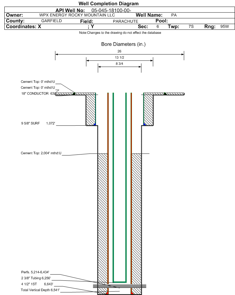 | Wellbore Completed | | Completion Date: | 3/21/2014 | | Spud Date: | 3/15/2014 | Spud Date Is: | ACTUAL | | Measured TD: | 6660 ft. | Measured PB depth: | 6609 ft. | | True Vertical TD: | 6541 ft. | True Vertical PB depth: | 6490 ft. | | Top PZ Location: | Sec:6 Twp: 7S 95W | Footage: 1496 FSL 1313 FWL | | Bottom Hole Location: | Sec:6 Twp: 7S 95W | Footage: 1473 FSL 1304 FWL | | Log Types: | CBL, Mud, and Reservoir Performance Monitor (RPM) | | Casing: | String Type: CONDUCTOR, Hole Size: 26 in., Size: 18 in., Top: 0 ft., Depth: 63 ft., Weight: 48 , Citings Type: ACTUAL | | Cement: | Sacks: 24, Top: 0 ft., Bottom: 63 ft., Determination Method: VISU | | Casing: | String Type: SURF, Hole Size: 13.5 in., Size: 9.625 in., Top: 0 ft., Depth: 1072 ft., Weight: 32.3 , Citings Type: ACTUAL | | Cement: | Sacks: 280, Top: 0 ft., Bottom: 1072 ft., Determination Method: VISU | | Casing: | String Type: 1ST, Hole Size: 8.75 in., Size: 4.5 in., Top: 0 ft., Depth: 6643 ft., Weight: 11.6 , Citings Type: ACTUAL | | Cement: | Sacks: 1150, Top: 2004 ft., Bottom: 6643 ft., Determination Method: CBL | | Formation | Interval Top | Log Bottom | Cored | DSTs | | WASATCH G | 1489 ft. | | | | | MESAVERDE | 3459 ft. | | | | | CAMEO | 5974 ft. | | | | | ROLLINS | 6504 ft. | | | |