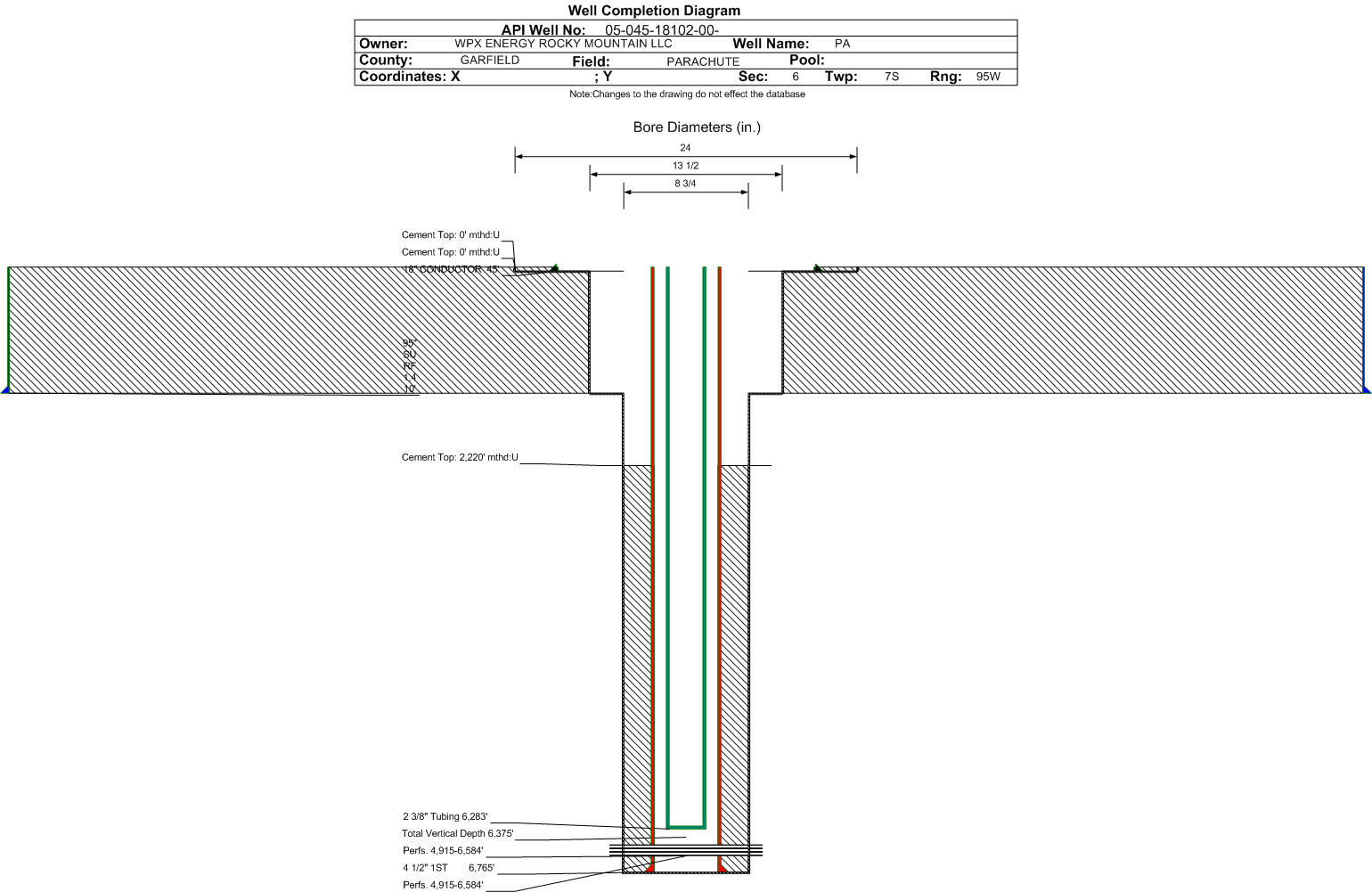 | Wellbore Completed | | Completion Date: | 5/12/2009 | | Spud Date: | 5/3/2009 | Spud Date Is: | ACTUAL | | Measured TD: | 6785 ft. | Measured PB depth: | 6724 ft. | | True Vertical TD: | 6375 ft. | True Vertical PB depth: | 6314 ft. | | Top PZ Location: | Sec:7 Twp: 7S 95W | Footage: 949 FNL 682 FWL | | Bottom Hole Location: | Sec:7 Twp: 7S 95W | Footage: 949 FNL 682 FWL | | Log Types: | CBL, RMTE, MUD, IND/DEN/NEU | | Casing: | String Type: CONDUCTOR, Hole Size: 24 in., Size: 18 in., Top: 0 ft., Depth: 45 ft., Weight: , Citings Type: ACTUAL | | Cement: | Sacks: 25, Top: 0 ft., Bottom: 45 ft., Determination Method: | | Casing: | String Type: SURF, Hole Size: 13.5 in., Size: 95 in., Top: 0 ft., Depth: 1410 ft., Weight: , Citings Type: ACTUAL | | Cement: | Sacks: 380, Top: 0 ft., Bottom: 1410 ft., Determination Method: | | Casing: | String Type: 1ST, Hole Size: 8.75 in., Size: 4.5 in., Top: 0 ft., Depth: 6765 ft., Weight: , Citings Type: ACTUAL | | Cement: | Sacks: 1012, Top: 2220 ft., Bottom: 6765 ft., Determination Method: CBL | | Formation | Interval Top | Log Bottom | Cored | DSTs | | WASATCH G | 1461 ft. | | N | N | | MESAVERDE | 3688 ft. | | N | N | | CAMEO | 5739 ft. | | N | N | | ROLLINS | 6672 ft. | | N | N |