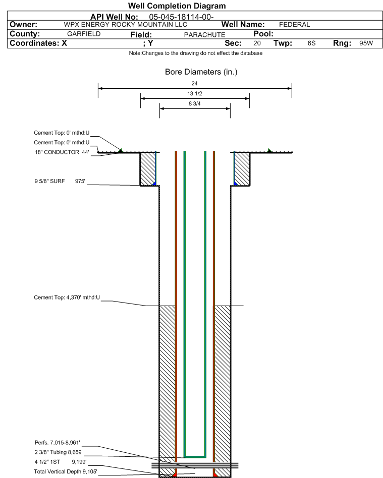 | Wellbore Completed | | Completion Date: | 9/9/2010 | | Spud Date: | 8/30/2010 | Spud Date Is: | ACTUAL | | Measured TD: | 9210 ft. | Measured PB depth: | 9108 ft. | | True Vertical TD: | 9105 ft. | True Vertical PB depth: | 9003 ft. | | Top PZ Location: | Sec:20 Twp: 6S 95W | Footage: 148 FNL 641 FEL | | Bottom Hole Location: | Sec:20 Twp: 6S 95W | Footage: 164 FNL 662 FEL | | Log Types: | GAMMA RAY, HIGH DEFINITION INDUCTION LOG, COMPENSATED Z-DENSILOG, COMPENSATED NEUTRON LOG, MUD AND CBL. | | Casing: | String Type: CONDUCTOR, Hole Size: 24 in., Size: 18 in., Top: 0 ft., Depth: 44 ft., Weight: , Citings Type: ACTUAL | | Cement: | Sacks: 15, Top: 0 ft., Bottom: 44 ft., Determination Method: VISU | | Casing: | String Type: SURF, Hole Size: 13.5 in., Size: 9.625 in., Top: 0 ft., Depth: 975 ft., Weight: , Citings Type: ACTUAL | | Cement: | Sacks: 290, Top: 0 ft., Bottom: 975 ft., Determination Method: VISU | | Casing: | String Type: 1ST, Hole Size: 8.75 in., Size: 4.5 in., Top: 0 ft., Depth: 9199 ft., Weight: , Citings Type: ACTUAL | | Cement: | Sacks: 1000, Top: 4370 ft., Bottom: 9199 ft., Determination Method: CBL | | Formation | Interval Top | Log Bottom | Cored | DSTs | | WASATCH G | 3260 ft. | | | | | MESAVERDE | 5582 ft. | | | | | CAMEO | 8257 ft. | | | | | ROLLINS | 9060 ft. | | | |