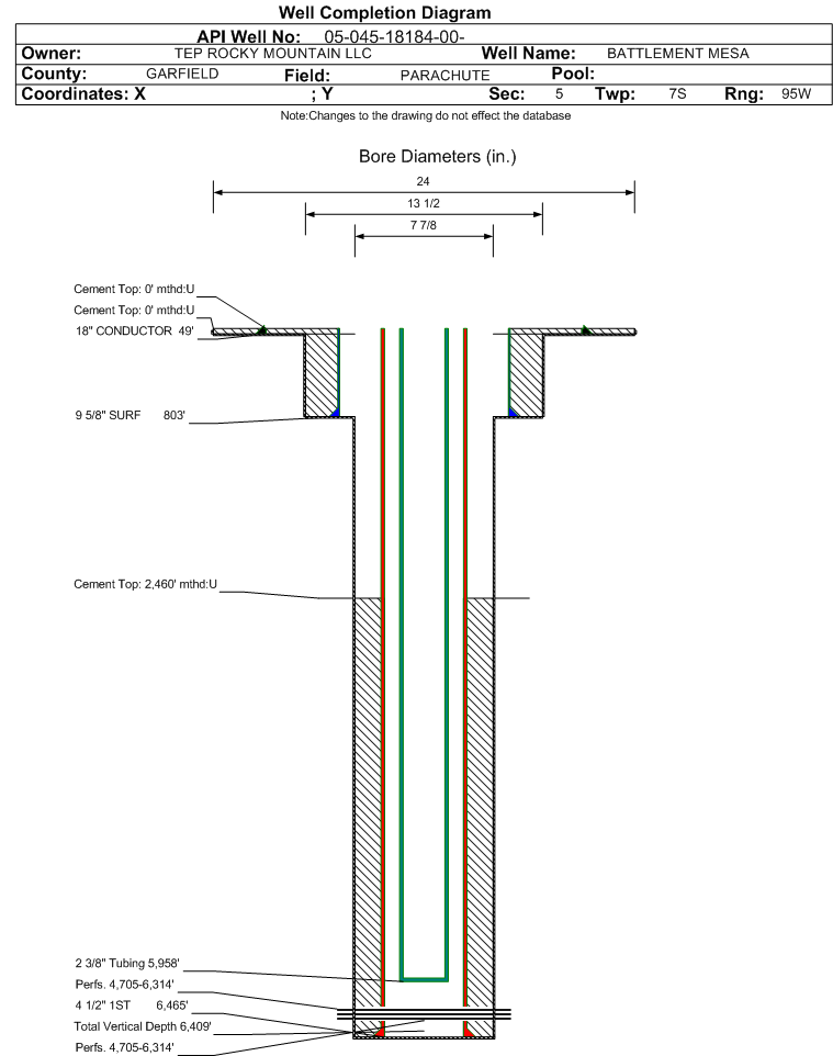 | Wellbore Completed | | Completion Date: | 10/25/2009 | | Spud Date: | 10/19/2009 | Spud Date Is: | ACTUAL | | Measured TD: | 6485 ft. | Measured PB depth: | 6403 ft. | | True Vertical TD: | 6409 ft. | True Vertical PB depth: | 6327 ft. | | Top PZ Location: | Sec:5 Twp: 7S 95W | Footage: 1537 FSL 2314 FWL | | Bottom Hole Location: | Sec:5 Twp: 7S 95W | Footage: 1537 FSL 2314 FWL | | Log Types: | CBL, HIGH RESOLUTION INDUCTION, SPECTRAL DENSITY, DUAL NEUTRON, MUD | | Casing: | String Type: CONDUCTOR, Hole Size: 24 in., Size: 18 in., Top: 0 ft., Depth: 49 ft., Weight: , Citings Type: ACTUAL | | Cement: | Sacks: 18, Top: 0 ft., Bottom: 49 ft., Determination Method: | | Casing: | String Type: SURF, Hole Size: 13.5 in., Size: 9.625 in., Top: 0 ft., Depth: 803 ft., Weight: , Citings Type: ACTUAL | | Cement: | Sacks: 250, Top: 0 ft., Bottom: 803 ft., Determination Method: | | Casing: | String Type: 1ST, Hole Size: 7.875 in., Size: 4.5 in., Top: 0 ft., Depth: 6465 ft., Weight: , Citings Type: ACTUAL | | Cement: | Sacks: 785, Top: 2460 ft., Bottom: 6465 ft., Determination Method: CBL | | Formation | Interval Top | Log Bottom | Cored | DSTs | | WASATCH G | 1243 ft. | | N | N | | MESAVERDE | 3353 ft. | | N | N | | CAMEO | 5837 ft. | | N | N | | ROLLINS | 6390 ft. | | N | N |