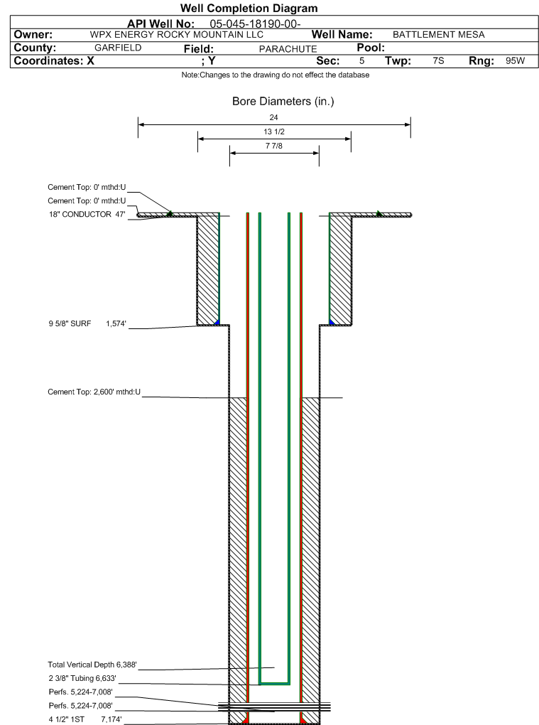 Wellbore #00 Wellbore Classification: GW Status: PR - 4/16/2011 Measured TD: 7186 ft. Vertical TD: 6388 ft.| Wellbore Data for Original Wellbore | Wellbore Classification: GW PR - 4/16/2011 | | Wellbore Permit | DIRECTIONAL | | Permit #: | 20088152 | Expiration Date: | 2/16/2010 | | Proposed Top PZ Location: | Sec: Twp: | Footage: 1000 FSL 624 FWL | | Bottom Hole Location: | Sec:5 Twp: 7S 95W | Footage: 1000 FSL 624 FWL | | Proposed Depth/Form: | 7248 ft. | | Surface Mineral Owner Same: | No | | Mineral Owner: | FEE | Surface Owner: | FEE | | Unit: | | Unit Number: | | | Formation And Spacing: | Code: WMFK , Formation: WILLIAMS FORK , Order: 440-36 , Unit Acreage: 320, Drill Unit: S2 |