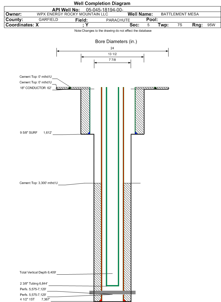 Wellbore #00 Wellbore Classification: GW Status: PR - 2/28/2010 Measured TD: 7382 ft. Vertical TD: 6409 ft.| Wellbore Data for Original Wellbore | Wellbore Classification: GW PR - 2/28/2010 | | Wellbore Permit | DIRECTIONAL | | Permit #: | 20088145 | Expiration Date: | 2/16/2010 | | Proposed Top PZ Location: | Sec: Twp: | Footage: 312 FSL 636 FWL | | Bottom Hole Location: | Sec:5 Twp: 7S 95W | Footage: 312 FSL 636 FWL | | Proposed Depth/Form: | 7394 ft. | | Surface Mineral Owner Same: | No | | Mineral Owner: | FEE | Surface Owner: | FEE | | Unit: | | Unit Number: | | | Formation And Spacing: | Code: WMFK , Formation: WILLIAMS FORK , Order: 440-36 , Unit Acreage: 320, Drill Unit: S2 | | Casing: | String Type: CONDUCTOR, Hole Size: 24 in., Size: 18 in., Top: , Depth: 45 ft., Weight: 48 , Citings Type: PLANNED | | Cement: | Sacks: 25, Top: 0 ft., Bottom: 45 ft. | | Casing: | String Type: SURF, Hole Size: 13.5 in., Size: 9.625 in., Top: , Depth: 1608 ft., Weight: 32.3 , Citings Type: PLANNED | | Cement: | Sacks: , Top: 0 ft., Bottom: 1608 ft. | | Casing: | String Type: 1ST, Hole Size: 7.875 in., Size: 4.5 in., Top: , Depth: 7394 ft., Weight: 11.6 , Citings Type: PLANNED | | Cement: | Sacks: , Top: , Bottom: |