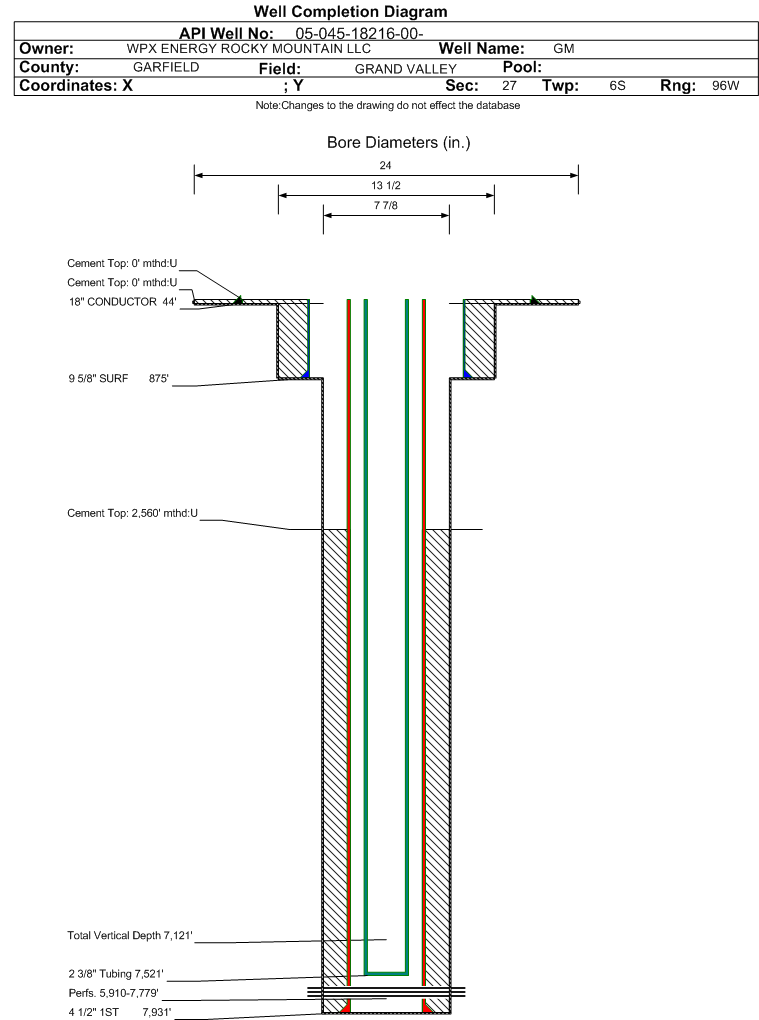 Wellbore #00 Wellbore Classification: GW Status: PR - 4/16/2011 Measured TD: 7948 ft. Vertical TD: 7121 ft.| Wellbore Data for Original Wellbore | Wellbore Classification: GW PR - 4/16/2011 | | Wellbore Permit | DIRECTIONAL | | Permit #: | | Expiration Date: | 5/8/2011 | | Proposed Top PZ Location: | Sec:27 Twp: 6S 96W | Footage: 905 FNL 1303 FWL | | Bottom Hole Location: | Sec:27 Twp: 6S 96W | Footage: 905 FNL 1303 FWL | | Proposed Depth/Form: | 7838 ft. | | Surface Mineral Owner Same: | No | | Mineral Owner: | FEE | Surface Owner: | FEE | | Unit: | | Unit Number: | | | Formation And Spacing: | Code: WMFK , Formation: WILLIAMS FORK , Order: 479-17 , Unit Acreage: 320, Drill Unit: N/2 | | Casing: | String Type: CONDUCTOR, Hole Size: 24 in., Size: 18 in., Top: , Depth: 45 ft., Weight: 48# , Citings Type: PLANNED | | Cement: | Sacks: 25, Top: 0 ft., Bottom: 45 ft. | | Casing: | String Type: SURF, Hole Size: 13.5 in., Size: 9.625 in., Top: , Depth: 1213 ft., Weight: 32.3# , Citings Type: PLANNED | | Cement: | Sacks: 425, Top: 0 ft., Bottom: 1213 ft. | | Casing: | String Type: 1ST, Hole Size: 7.875 in., Size: 4.5 in., Top: , Depth: 7838 ft., Weight: 11.6# , Citings Type: PLANNED | | Cement: | Sacks: 570, Top: , Bottom: 7838 ft. |